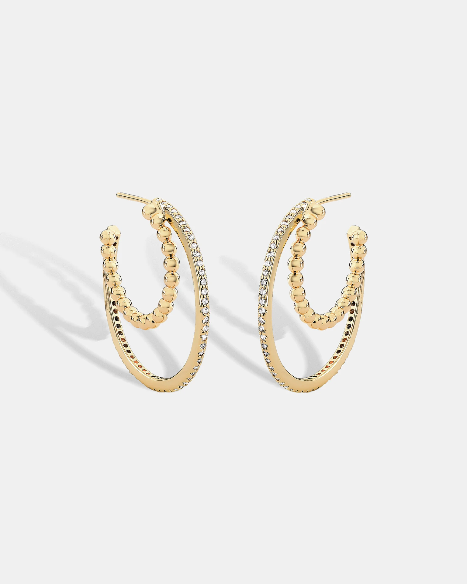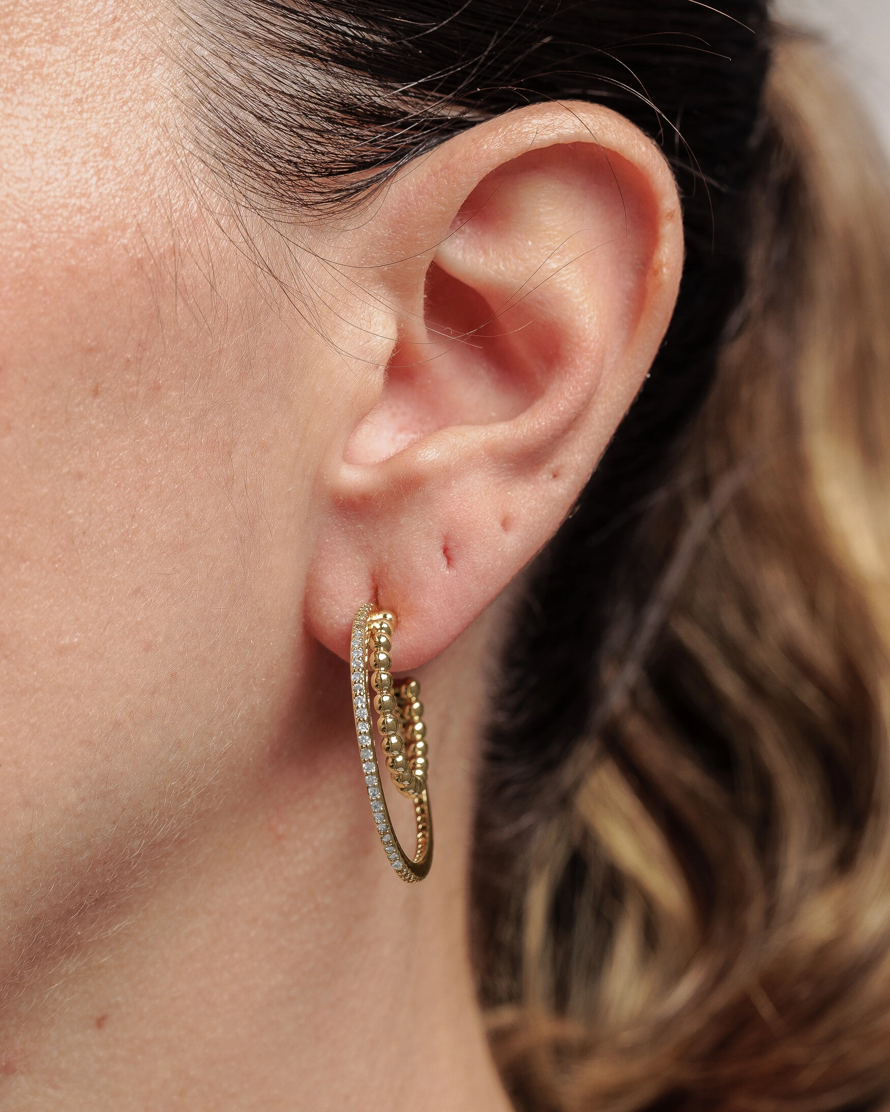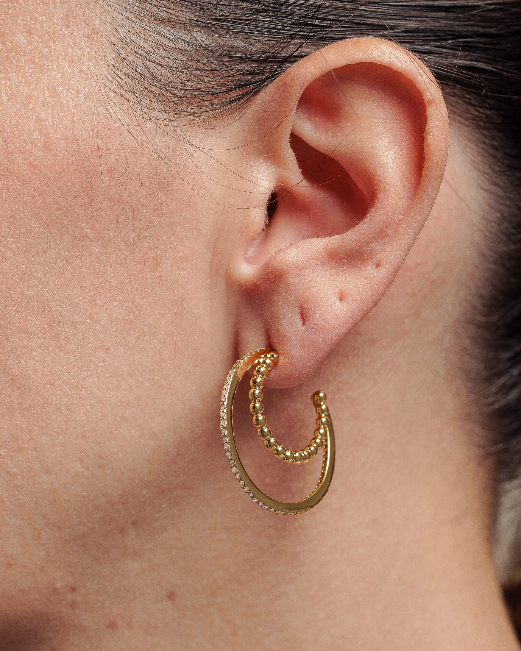 O Brinco Josy é formado por dois aros de tamanhos diferentes que se harmonizam por sua delicada elegância. A dupla composição apresenta o brilho vibrante da sequência de micro zircônias cristais em contraste com o refinamento de pequenas esferas douradas do aro interno. Disponível em banho de ouro 18k.