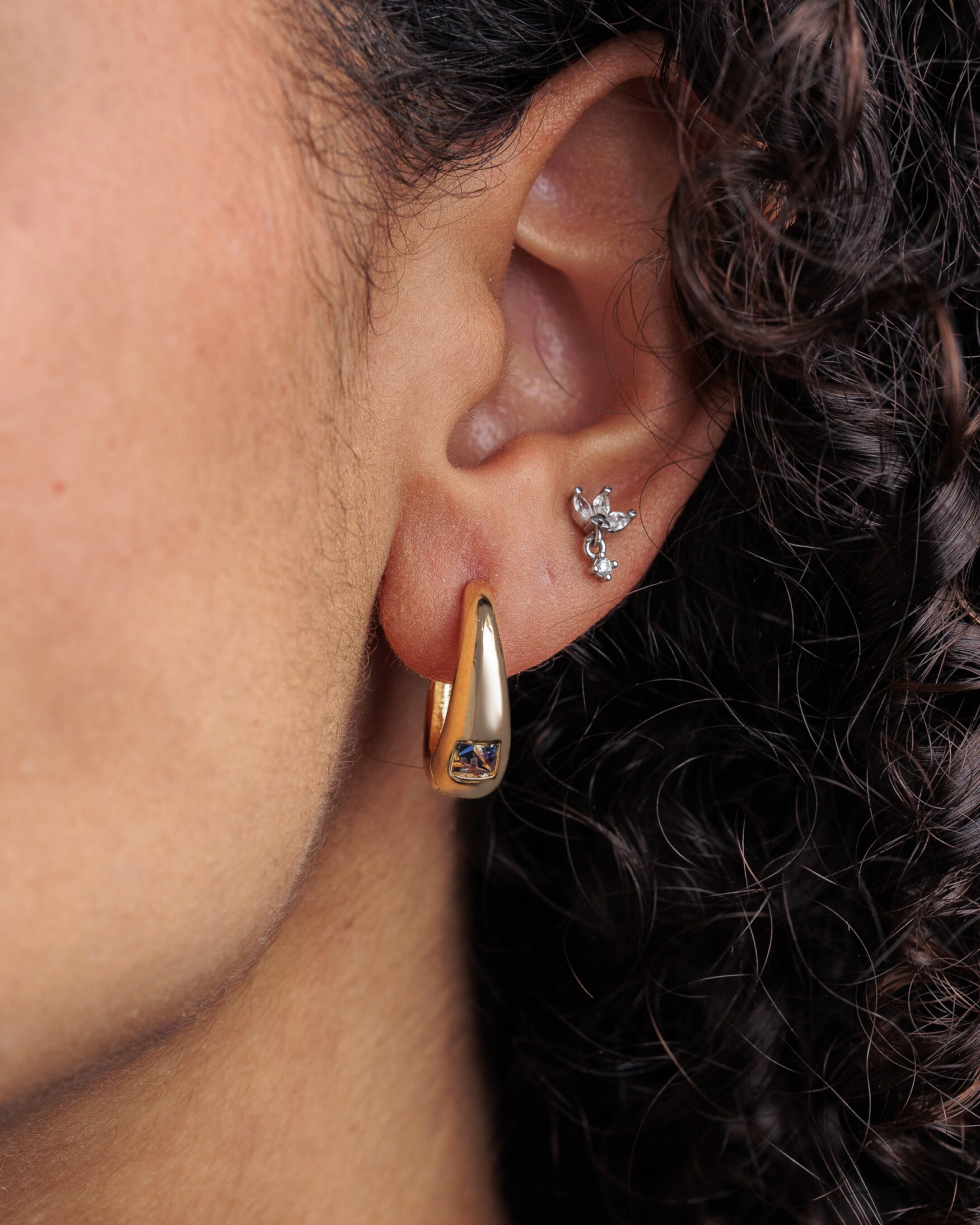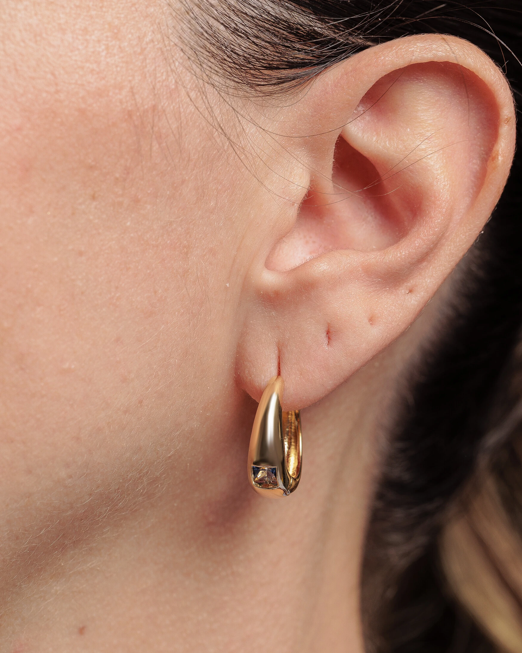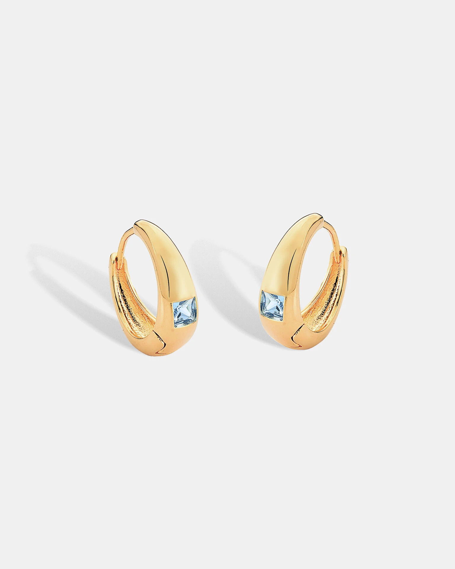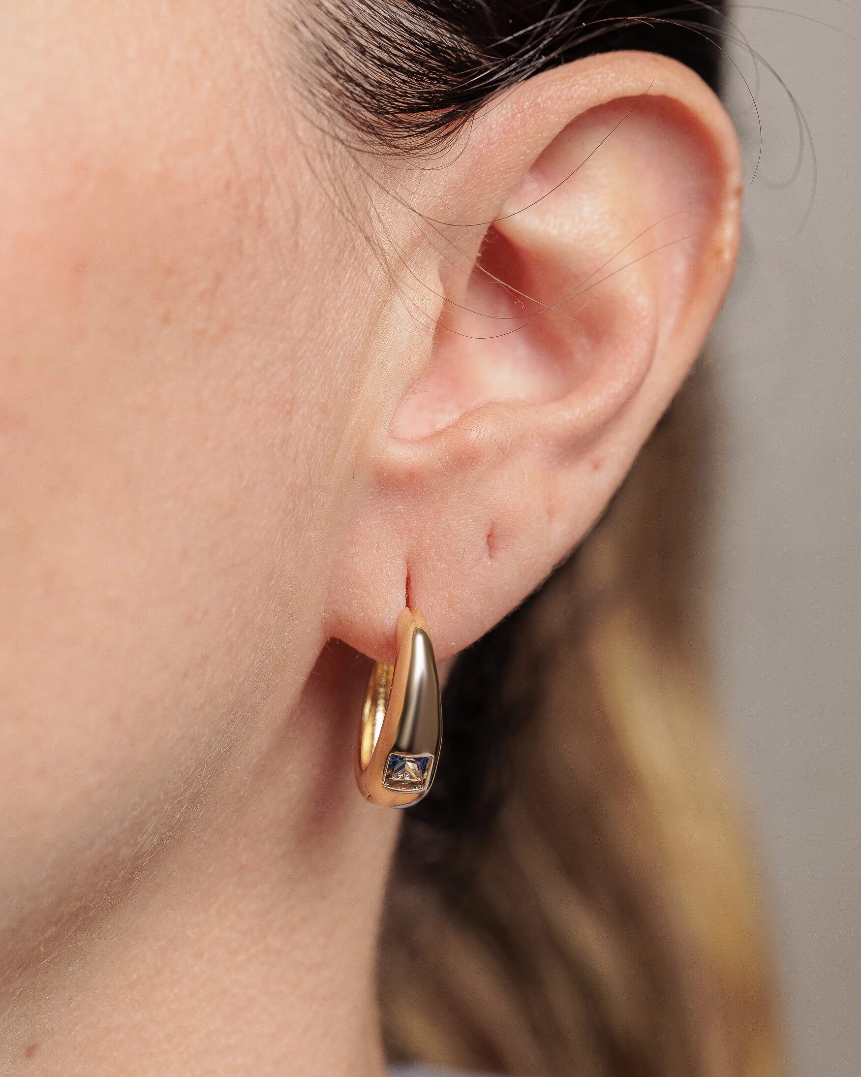 De linhas abauladas, a Argola Blue apresenta na sua parte frontal um detalhe Quadrado em zircônia Água Marinha, conferindo brilho e um toque sutil de elegância. É um modelo que encanta por sua praticidade e por combinar com qualquer estilo e ocasião. Disponível em banho de ouro 18k com fecho Click.