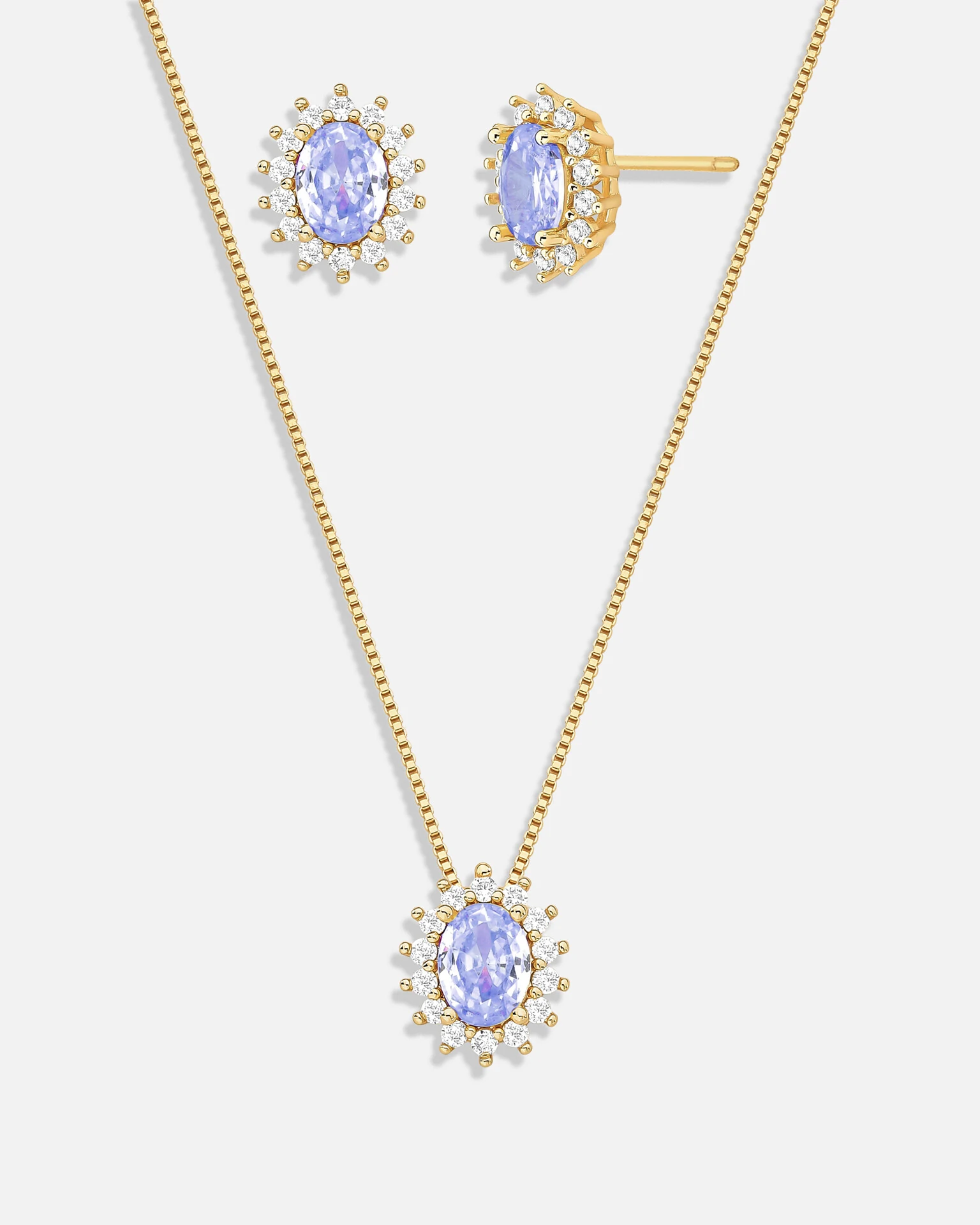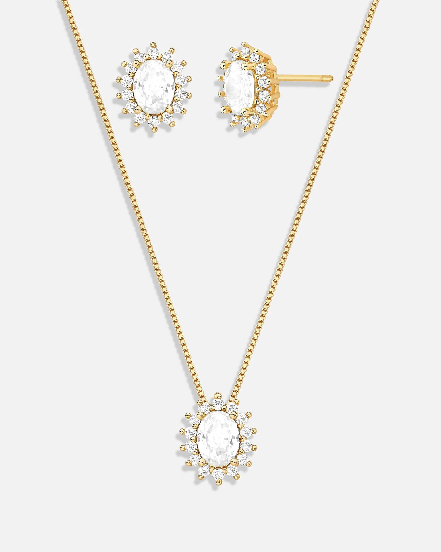 Conjunto com brinco e colar em banho de ouro 18k e pingente oval, adornado com zircônia e cristal lateral. Peças elegantes que combinam sofisticação e delicadeza, ideais para complementar seu estilo com brilho e charme
