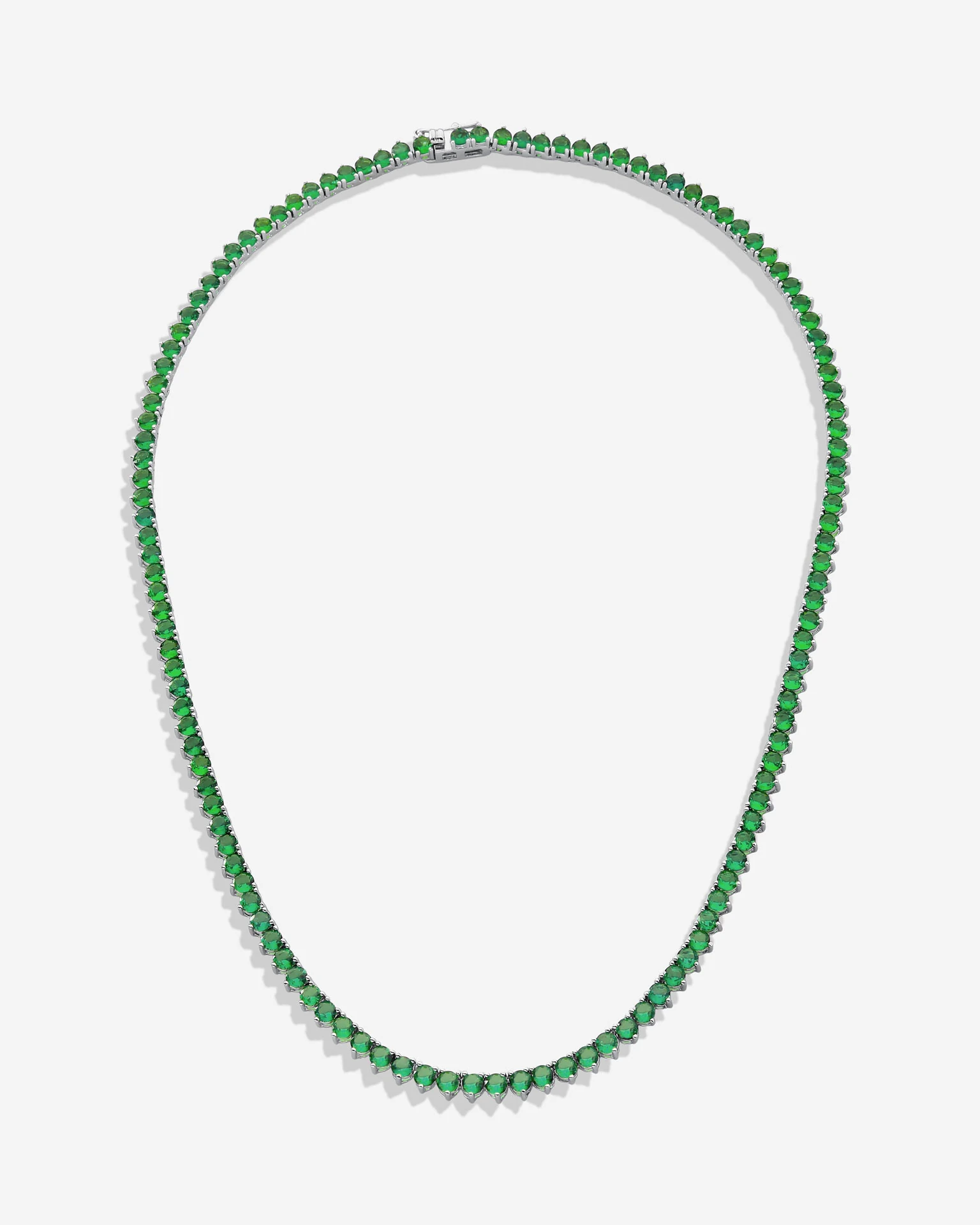 A estrutura de trama rígida, em banho de ródio branco, do elegante Colar Riviera é recoberta por uma seleção de maravilhosas Zircônias Esmeralda- 3 garras, em uma composição de nuances refinadas, resultando em um belo efeito visual. Possui fecho gaveta e trava de segurança.
