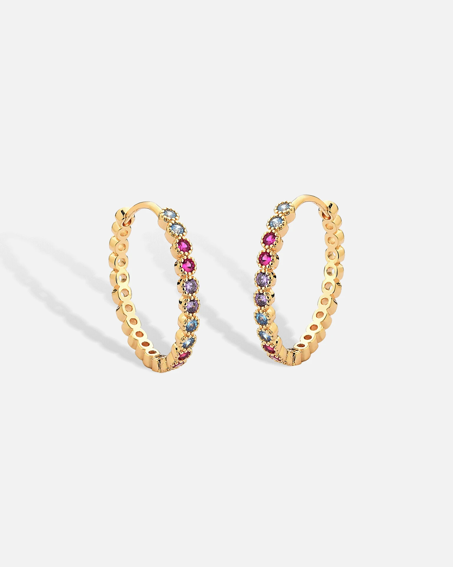 Argola Slim Color, em banho de Oru 18k formado por zircônias redondas coloridas, uma peça delicada e atemporal