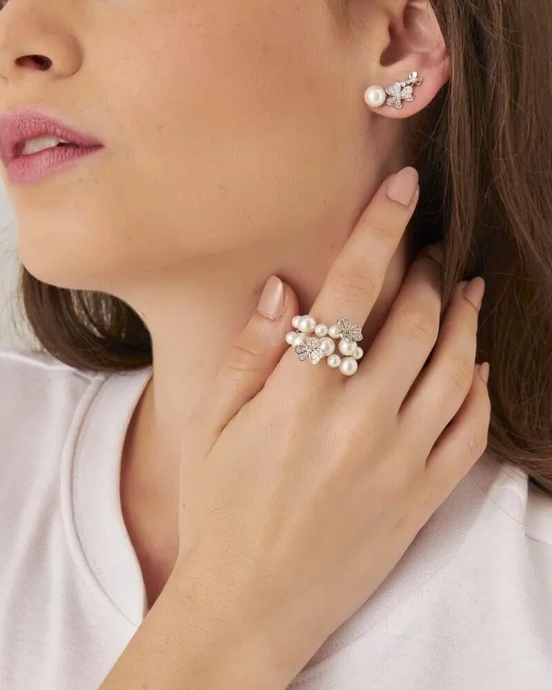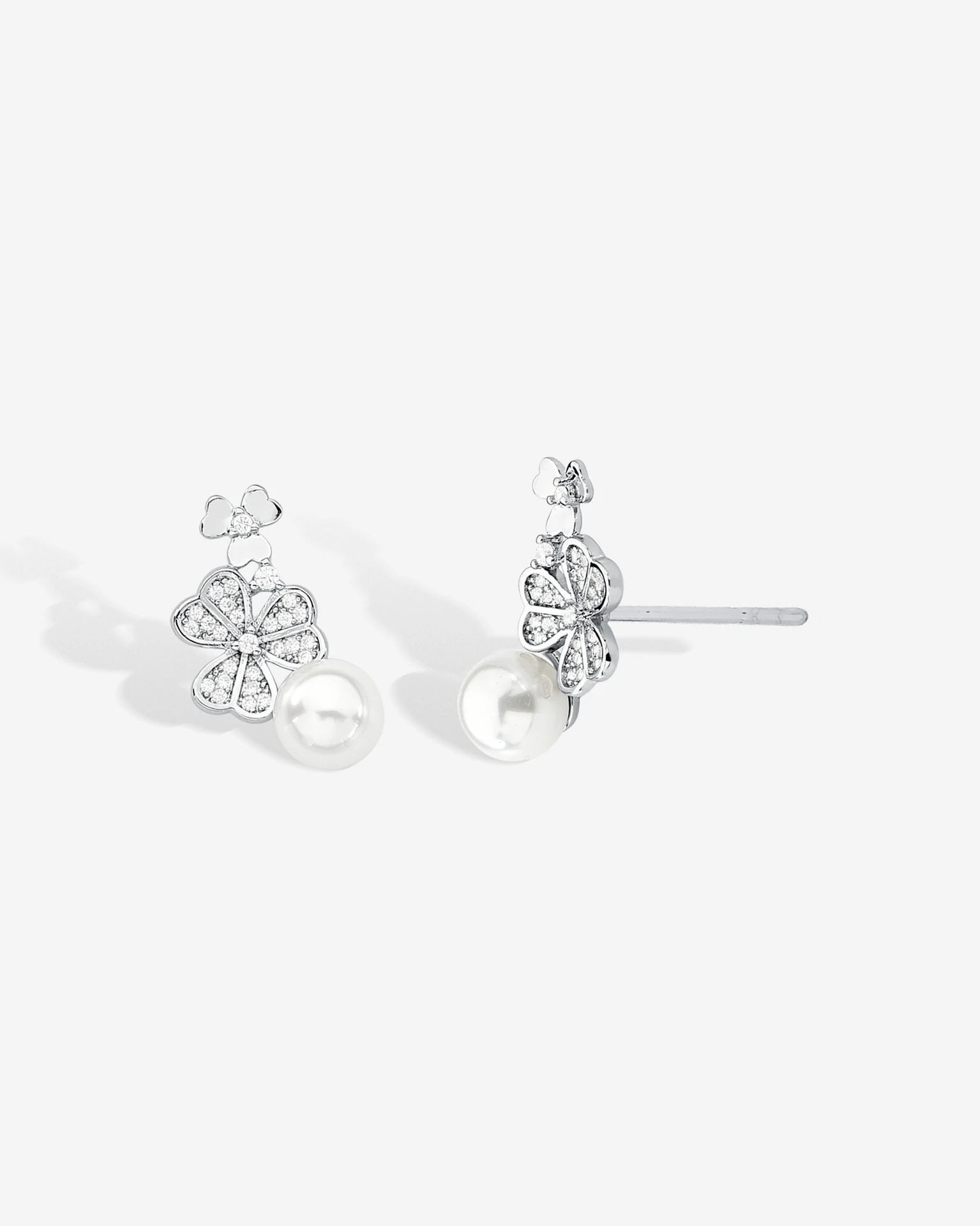 O Brinco Lucky Charm em banho de Ródio é composto por um trevo cravejado e uma pérola Shell. Deliciado e minimalista, permite diversas combinações.