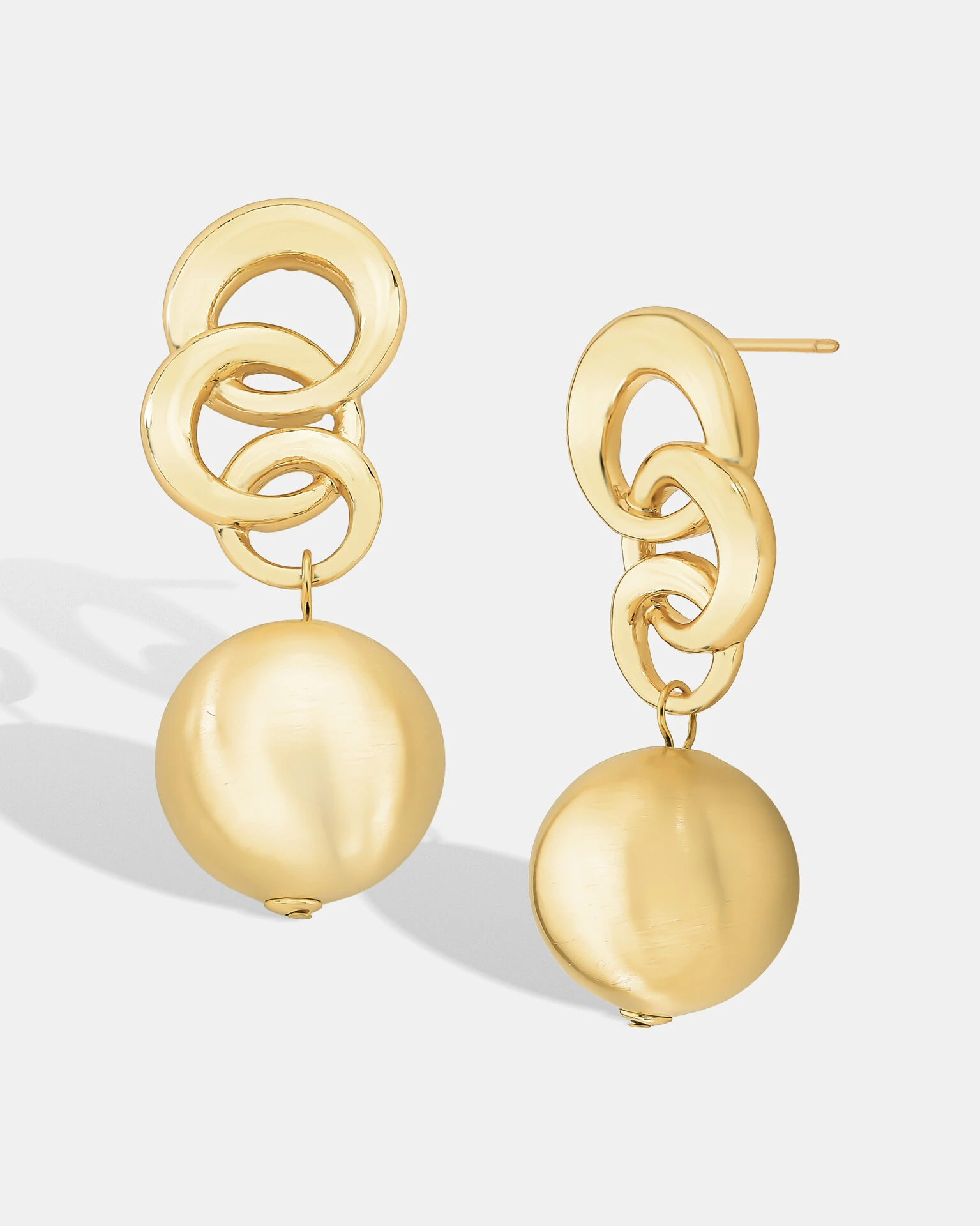 Brinco Bold Jade formado por elos em banho de ouro 18k, com um pingente de esferas acetinado, trazendo movimento à peça.