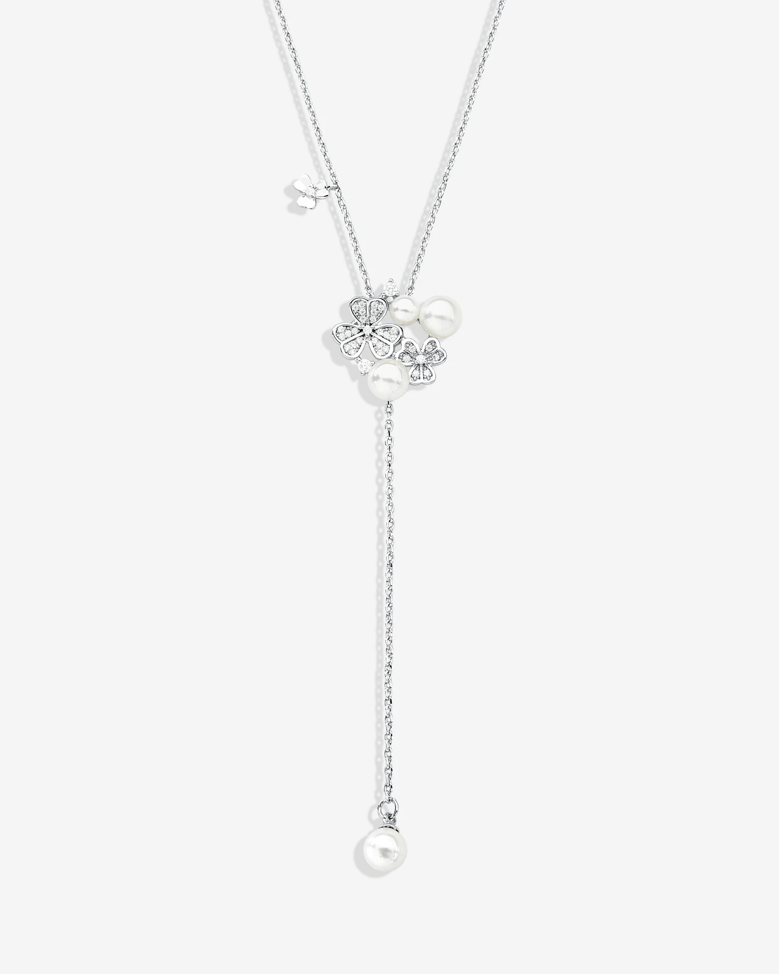 O Colar Gravata Lucky Charm em banho de Ródio é composto por um trevo cravejado e uma pérola Shell. Deliciado e minimalista, permite diversas combinações.