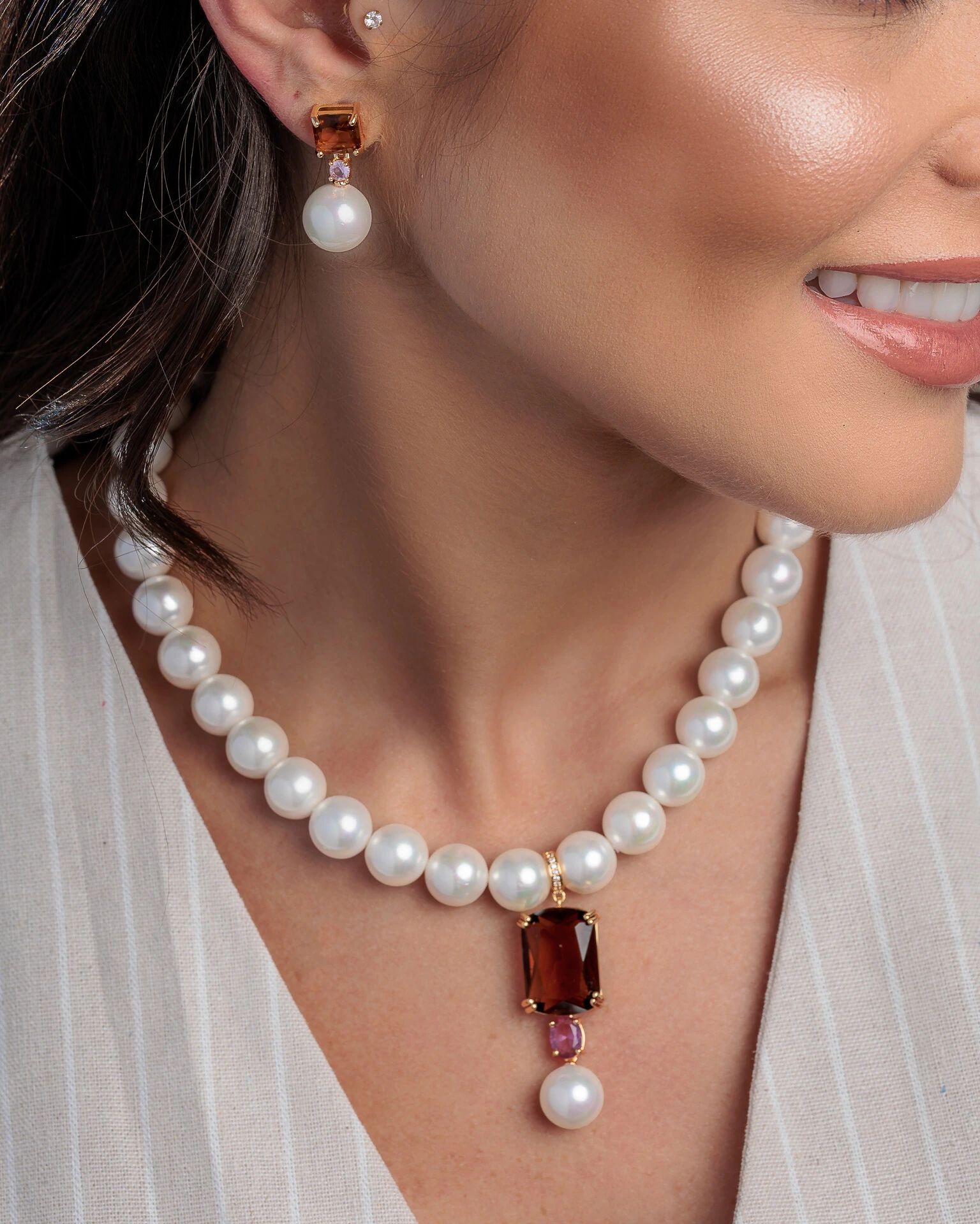 No centro, um pingente se destaca: uma pedra grande em formato retangular, de tom chocolate, montada em metal dourado. Finalizando o pingente, uma pérola solitária cai suavemente, trazendo harmonia entre o tradicional e o moderno.