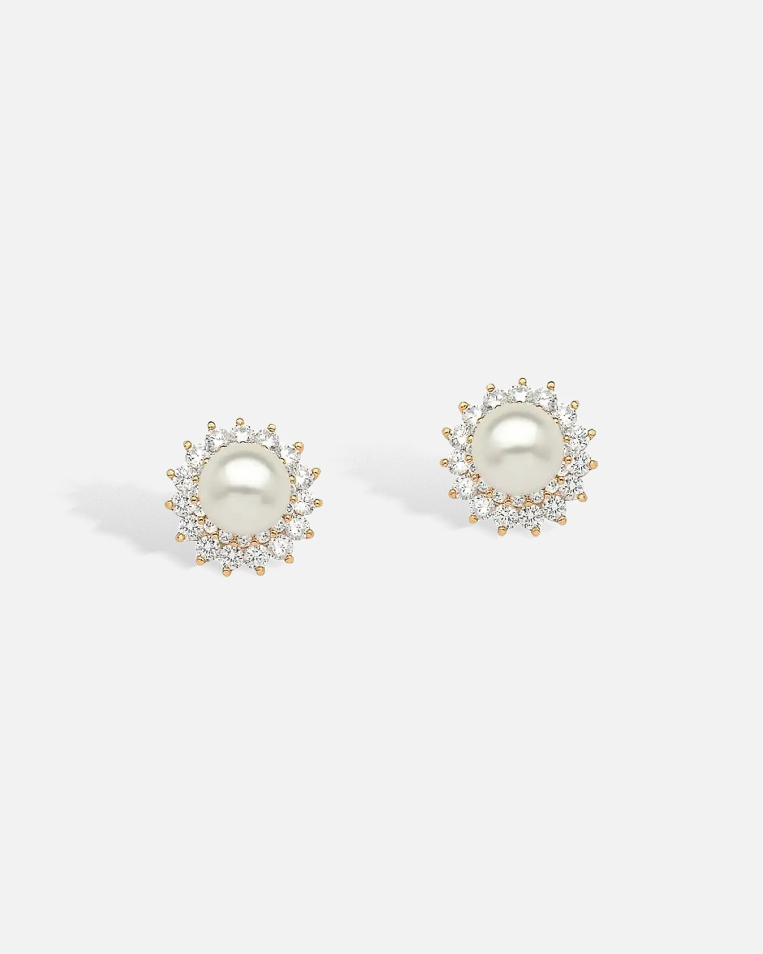 Brinco Pérola, com design em formato de flor, uma pérola shell central com zircônias cristais ao seu redor trazendo brilho à peça
