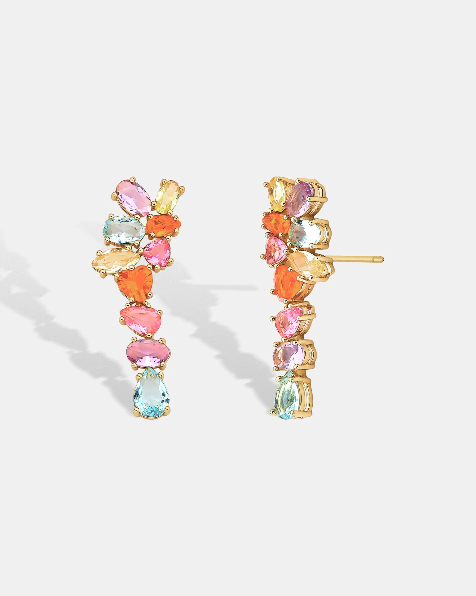 O Brinco Lapidações Color, em banho de Ouro18k, é formado por zircônias coloridas de diversas lapidações, que trazem brilho e energia à todas as suas composições.