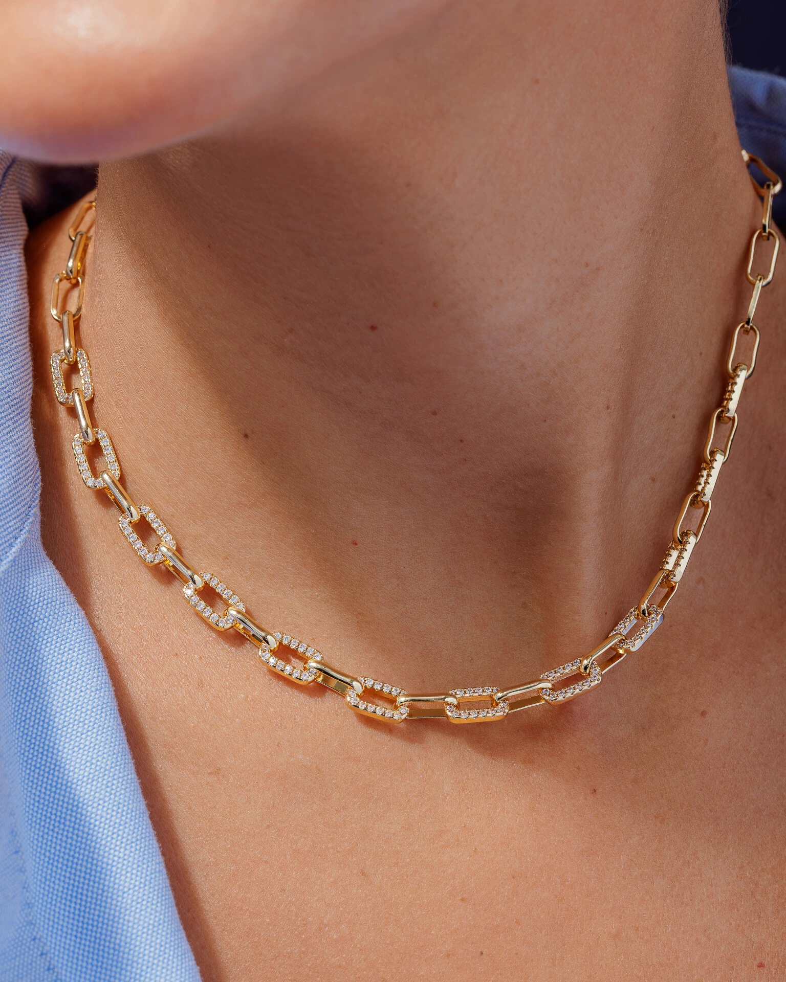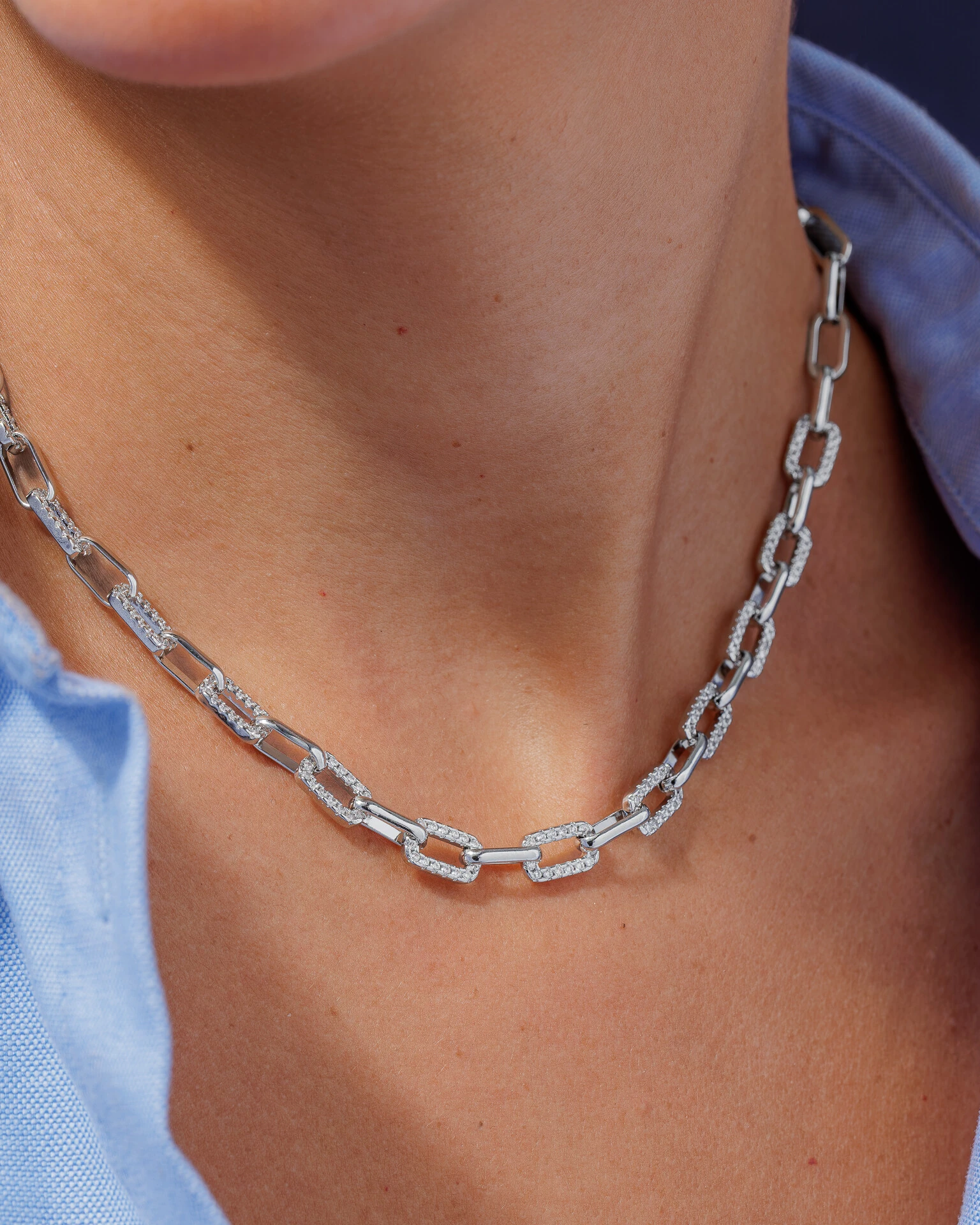 Colar formado por elos cravejado intercalados com elos liso, em banho de ródio e ou 18k, delicado e atemporal, ótimo para combinar looks