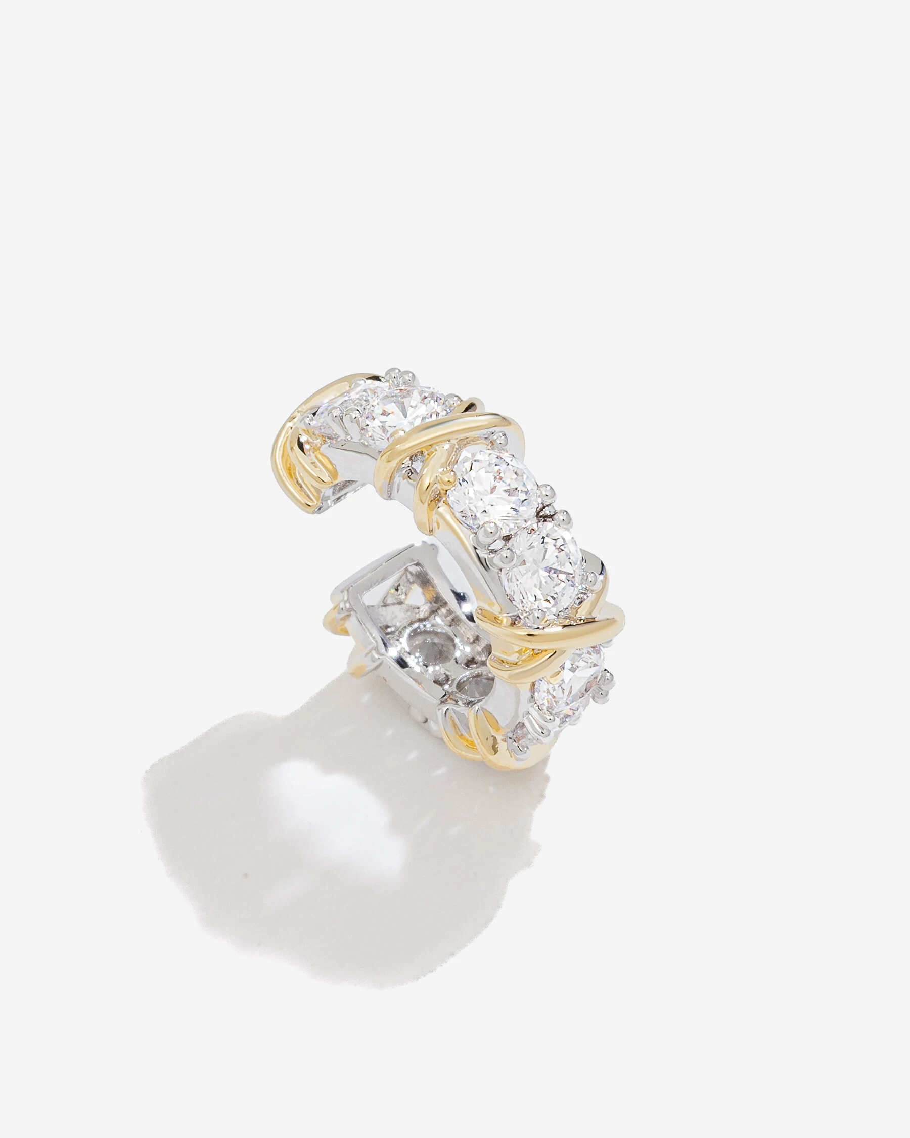 Pierciing Celeste, possui um elegante design que combina a beleza do duo de banhos; o refinamento do aro em banho de ródio branco com composição de Zircônias Cristais, delicadamente intercaladas por um X em banho de ouro 18k.
