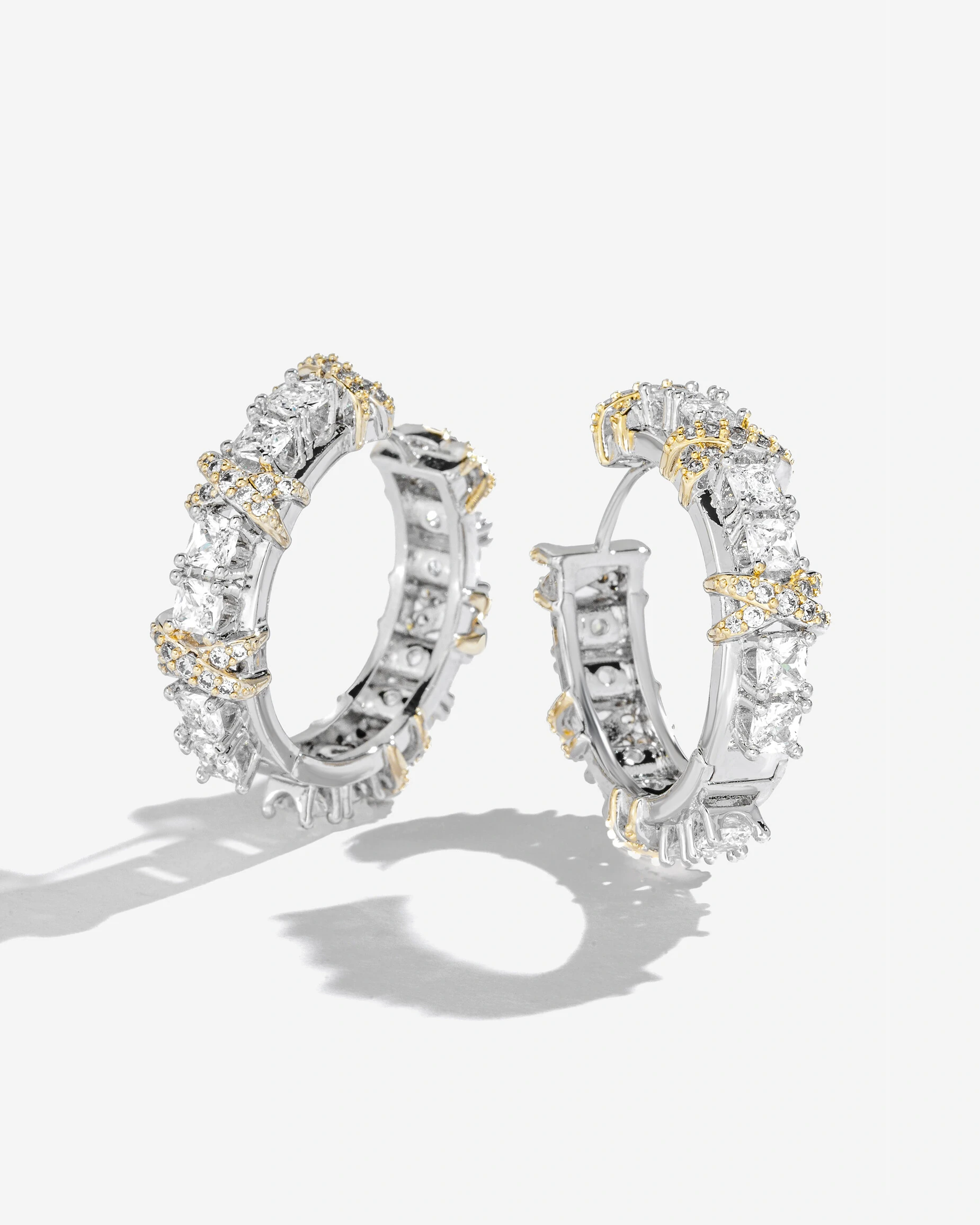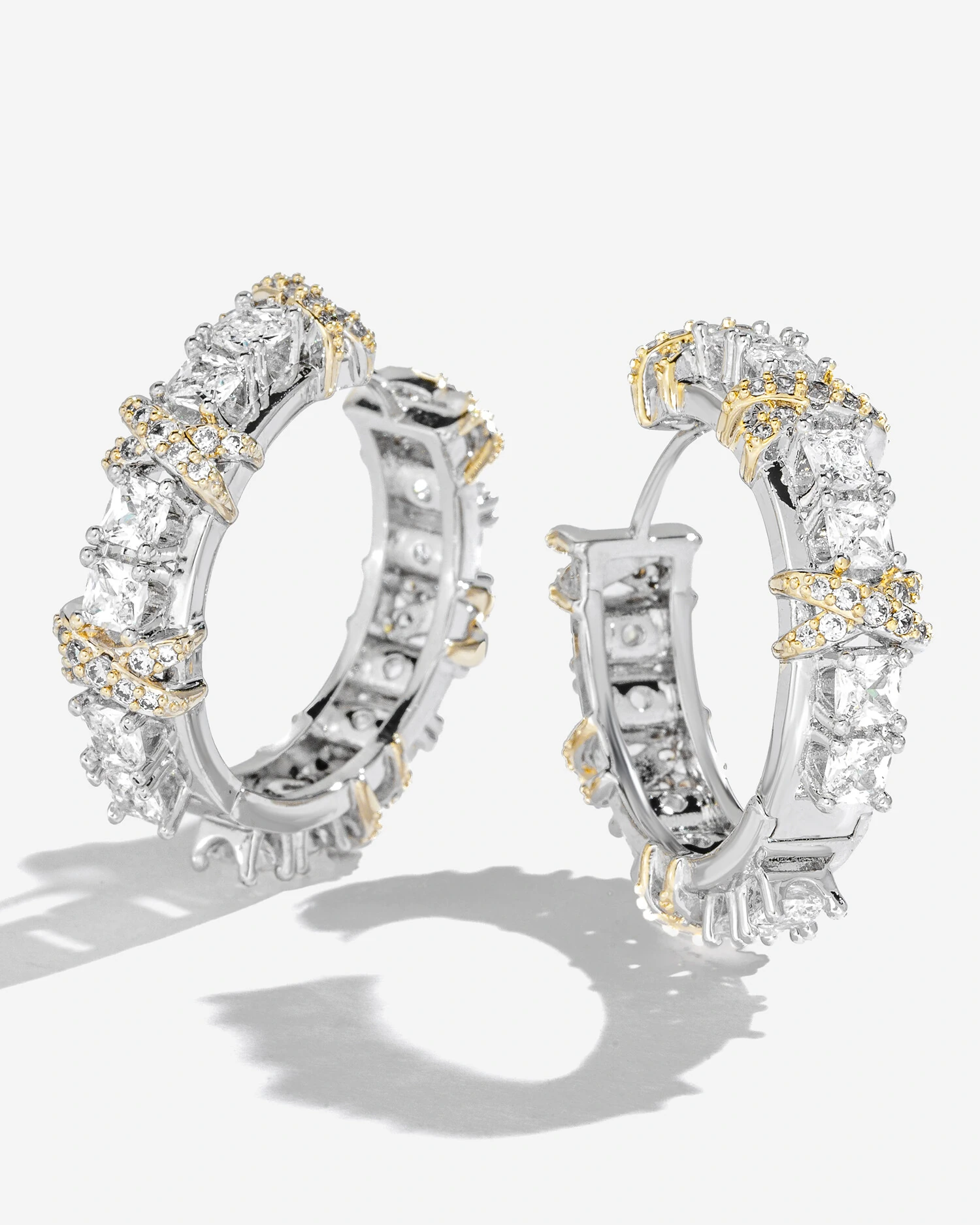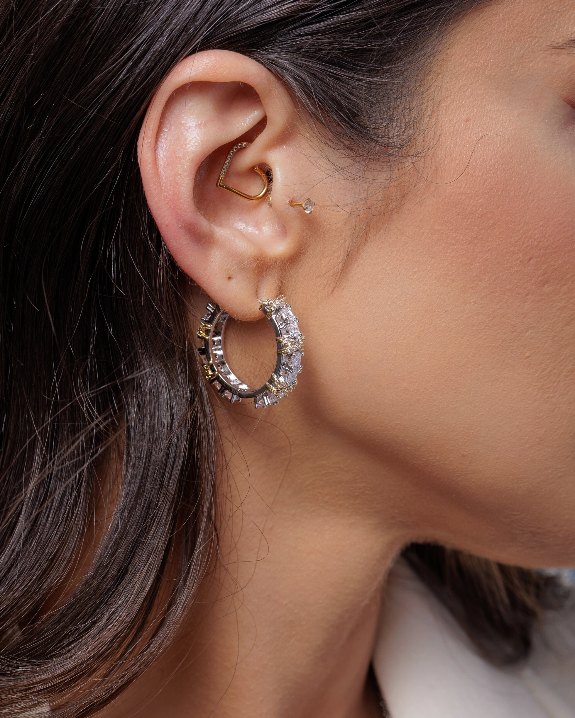 Brinco Argola Celeste, se destaca por seu elegante design que combina a beleza do duo de banhos e a composição de Zircônias Cristais. Aro em banho de ródio branco, intercalado por um X em banho de ouro 18k e cravação de zircönias cristais.