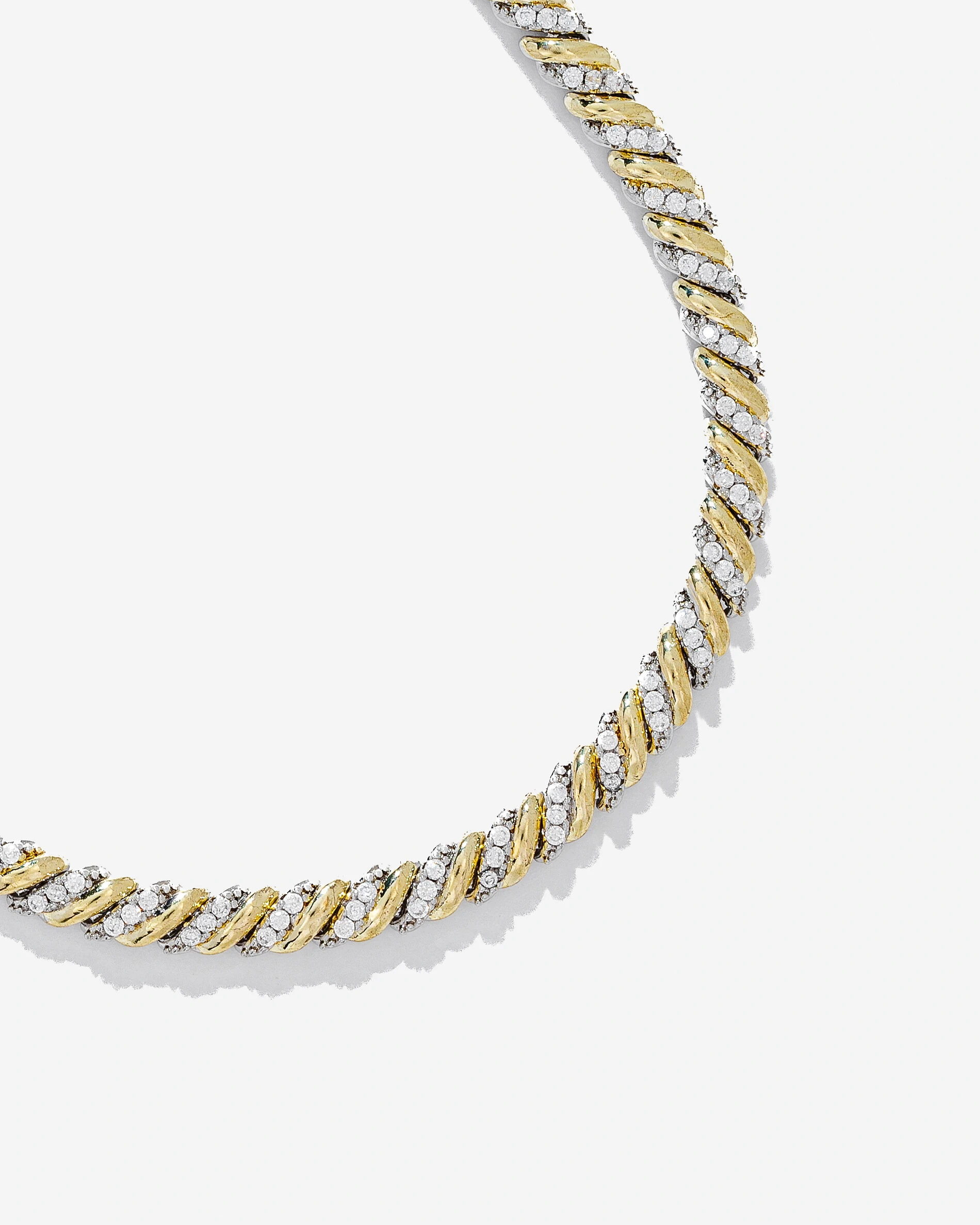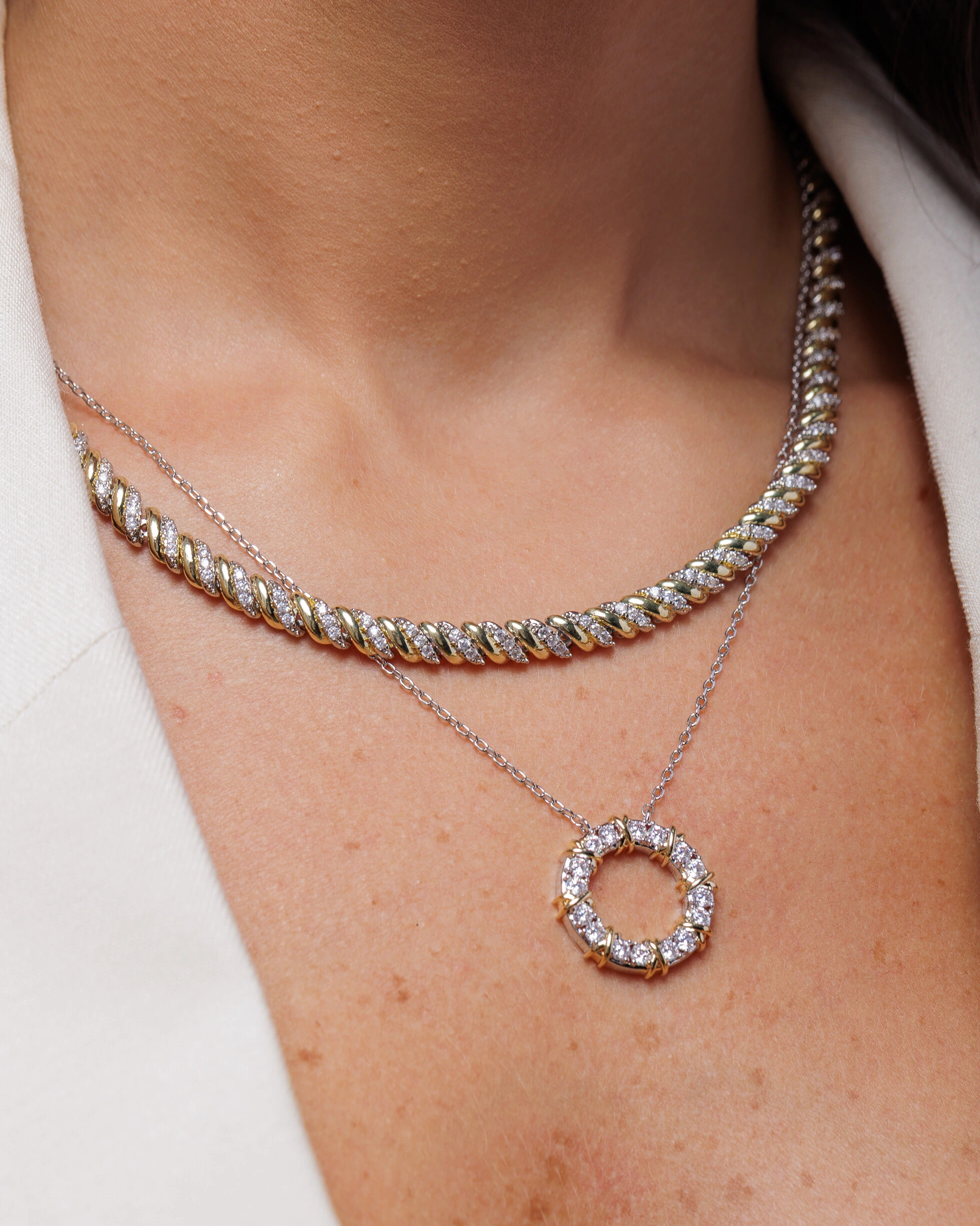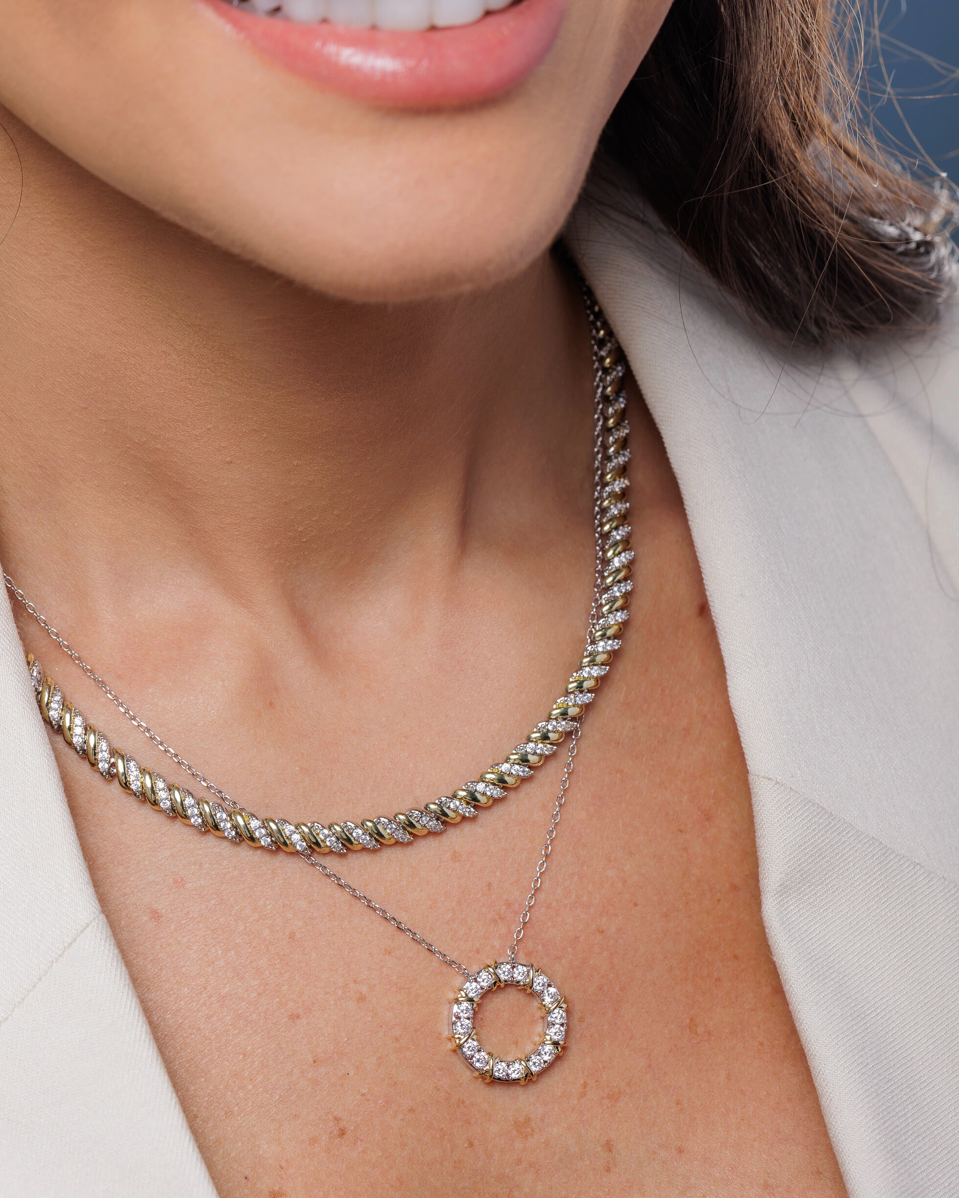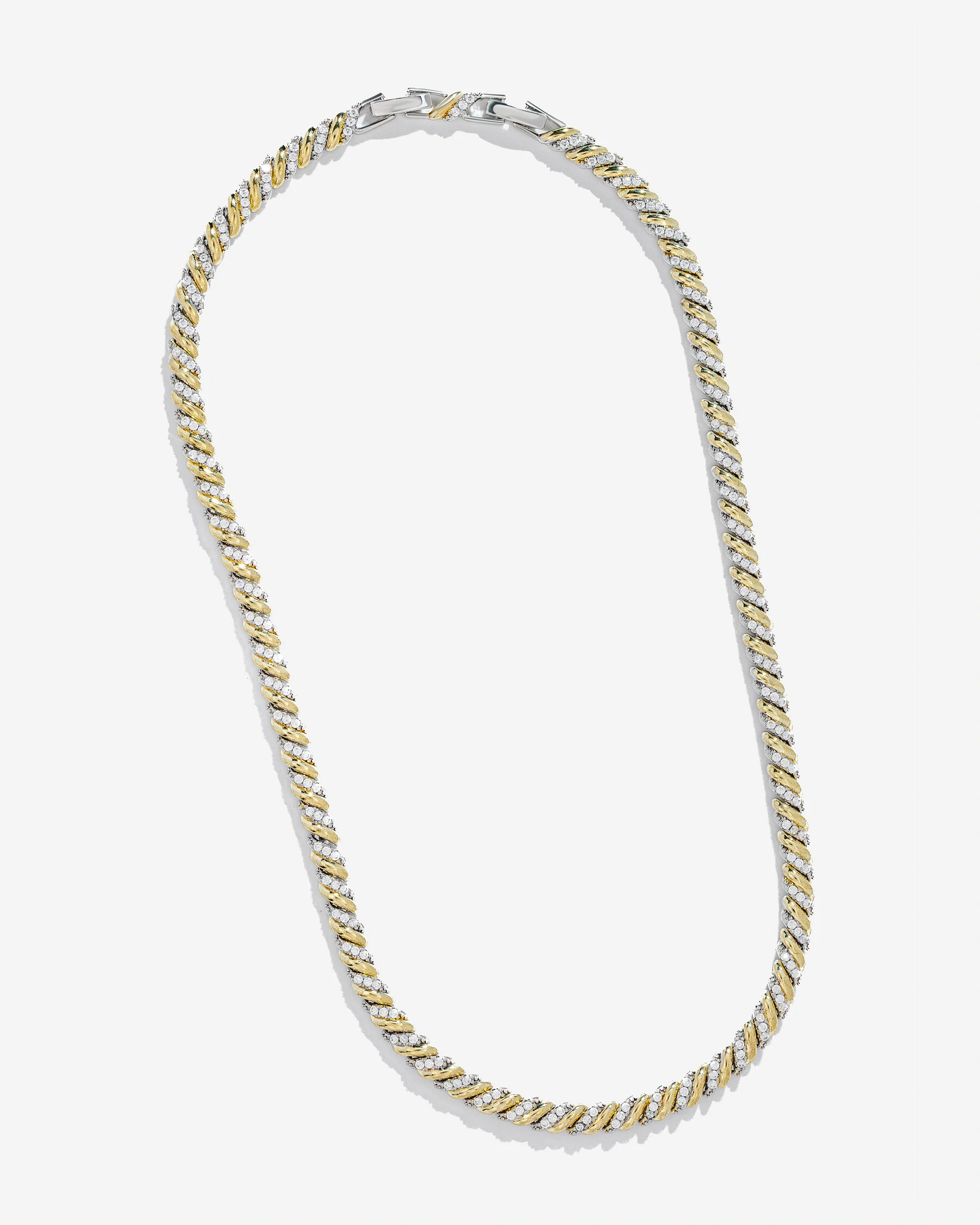 Colar Riviera Duo Shine Celeste, destaca um elegante design com duo de banhos, a corrente torcida em banho de ródio branco com uma composição de Zircônias Cristais, intercaladas por um filete em banho de ouro 18k.