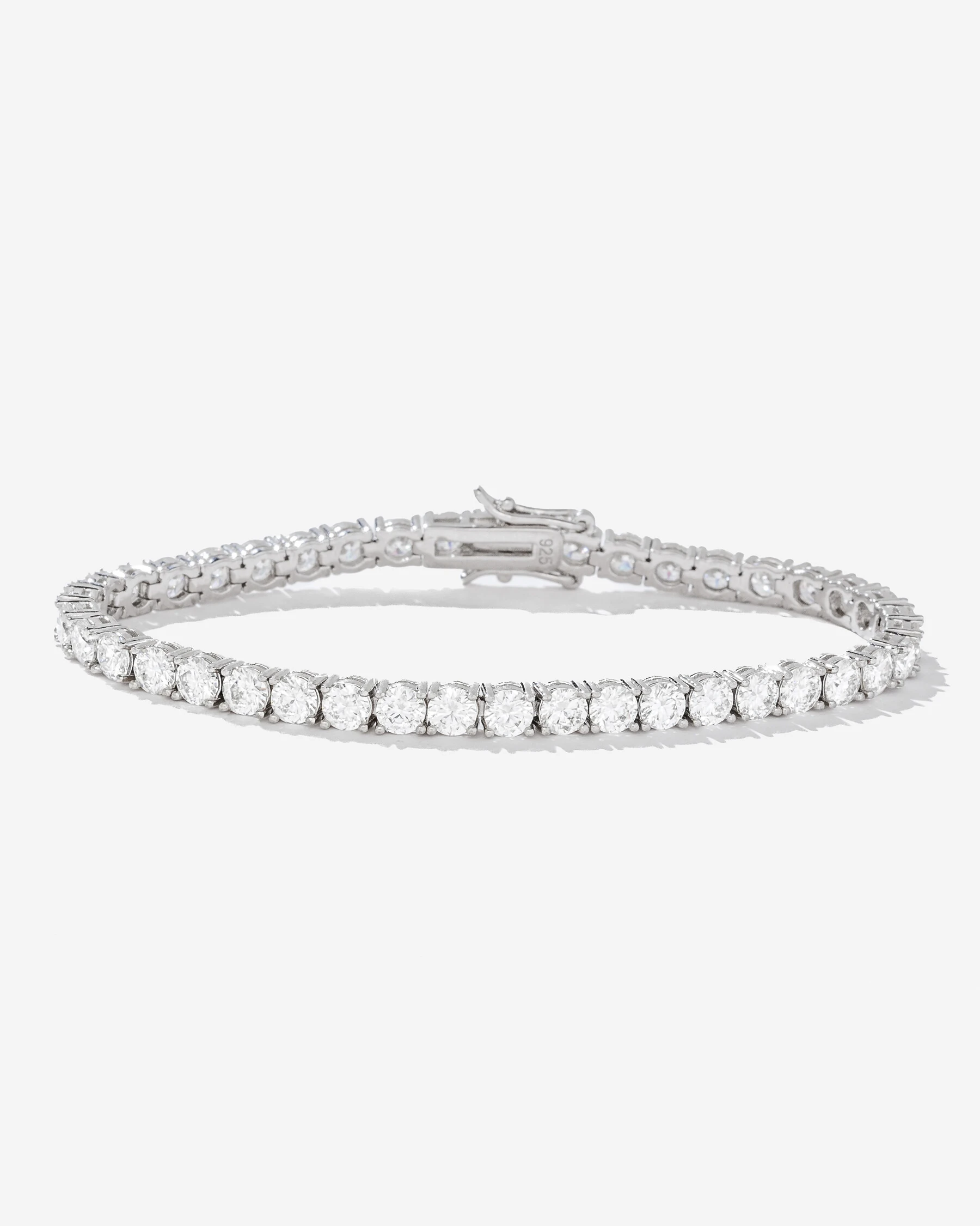 O fascinante brilho de Moissanites 4 mm, recobrem toda a Pulseira Riviera - 18 cm, uma joia super refinada e atemporal, confeccionada em prata 925 e banho de ródio branco. Sua pulseira de trama rígida faz com que ela não vire, permitindo que sua beleza esteja sempre visível e irradiando reflexos indescritíveis.