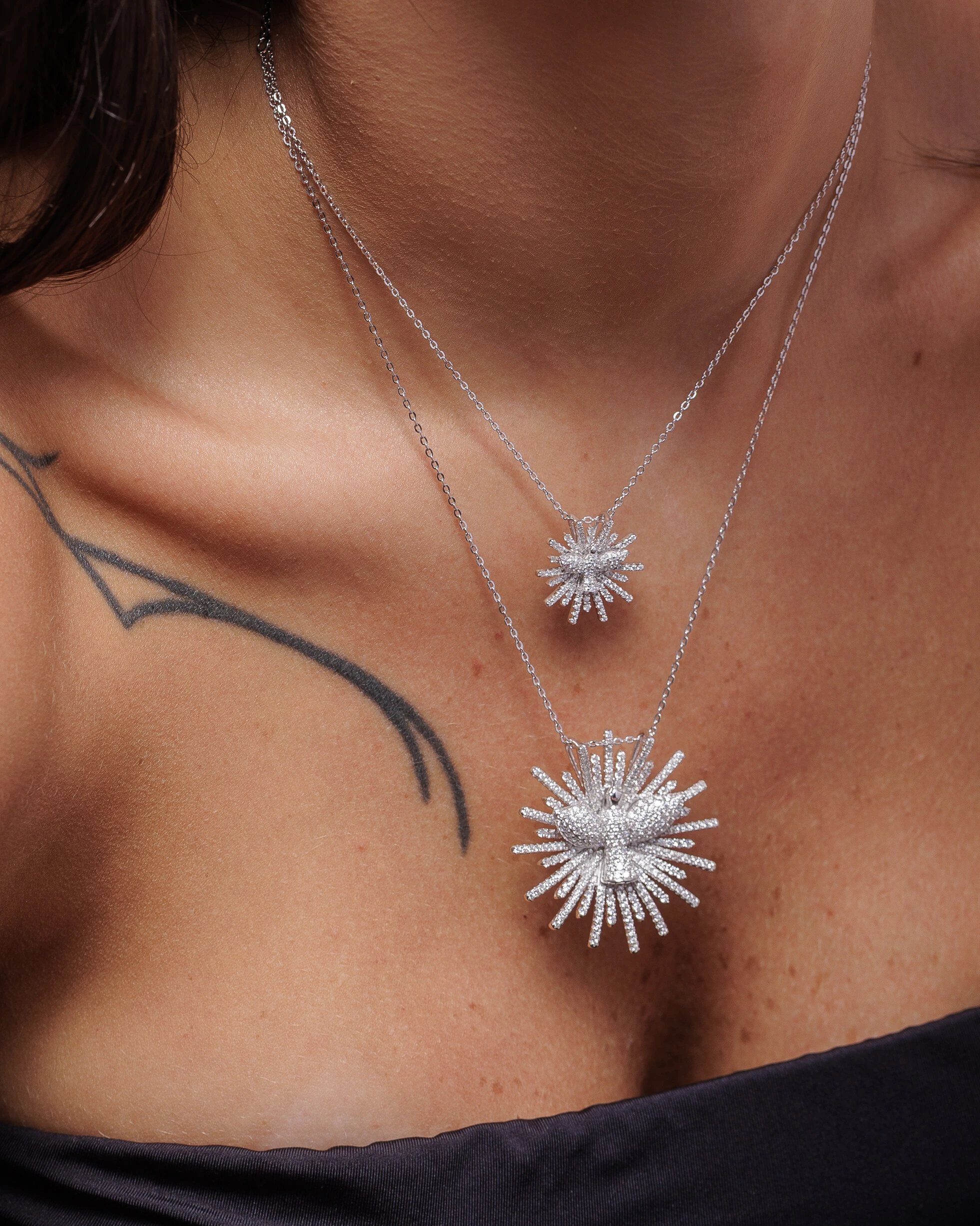 Colar religioso destacando o maravilhoso pingente de Espírito Santo, recoberto de pureza e emoção, transmitidos através dos reflexos maravilhosos de Moissanites. Confeccionado em prata 925 e banho de ródio branco.