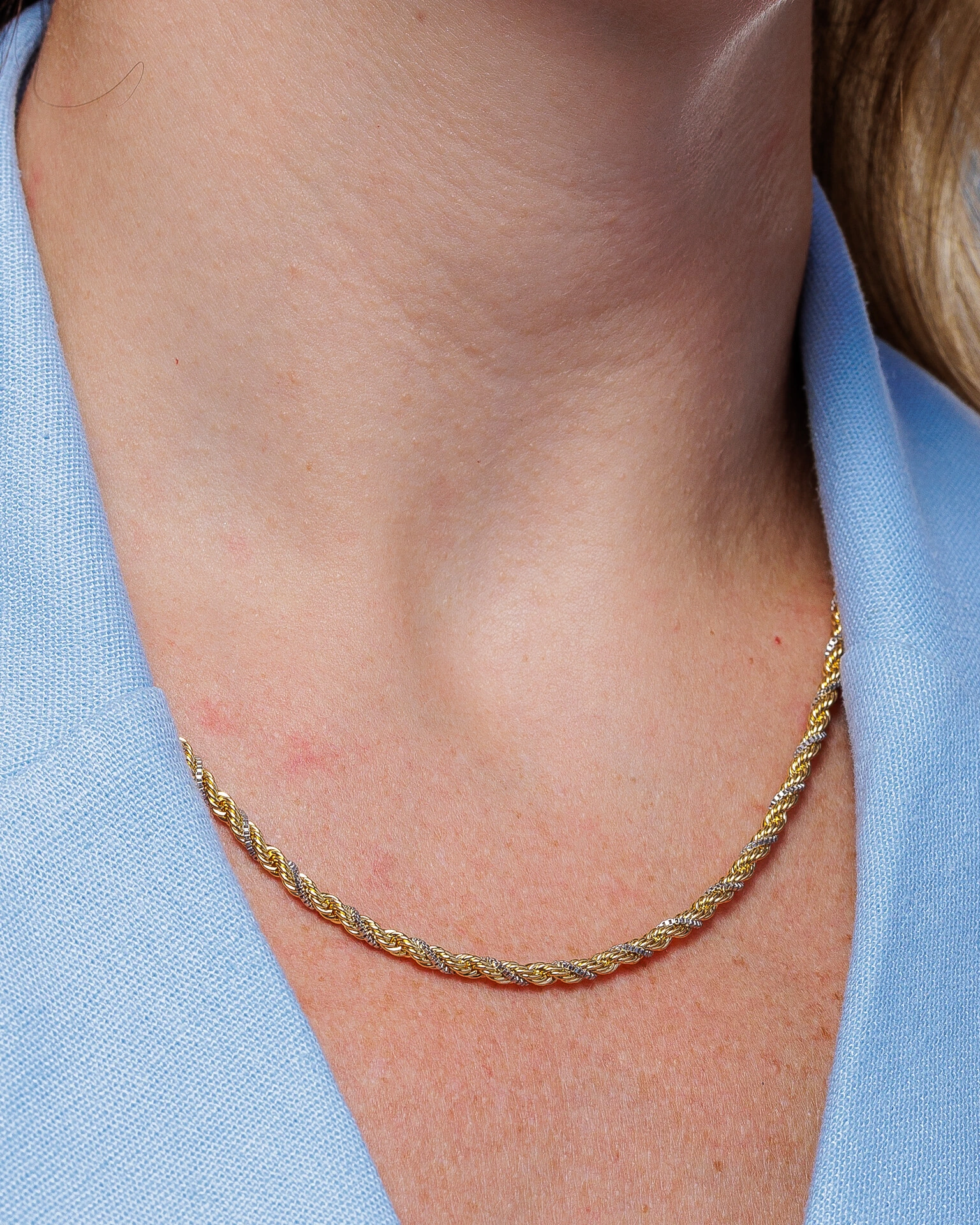 O sempre maravilhoso colar Isis de elos torcidos, em banho de ouro 18k, fica ainda mais elegante ao ser intercalado pela corrente de elos veneziana, em banho de ródio branco, criando um modelo irresistível para ser usado em qualquer momento de sua vida.