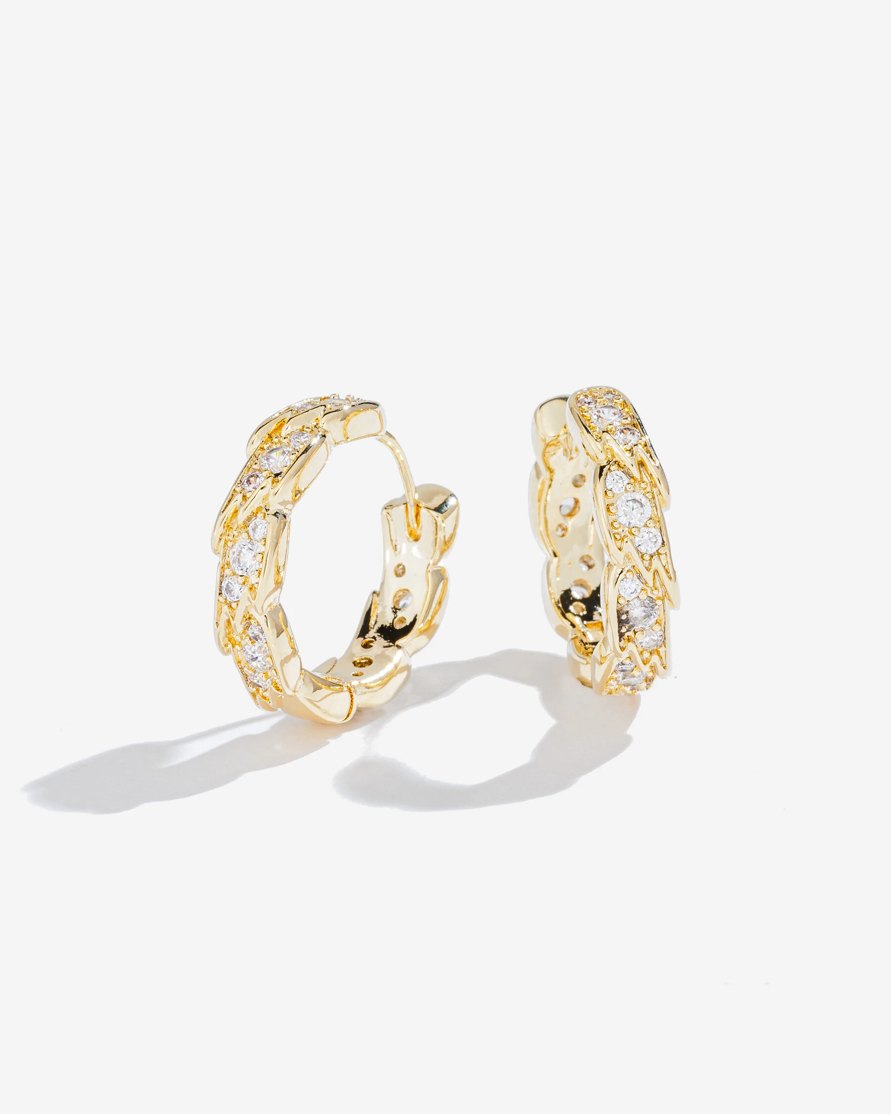 Brinco Francis - M, em banho de ouro 18k, se destaca por seu elegante design que combina a beleza do aro estilizado com escamas e o brilho maravilhoso de zircônias cristais.
