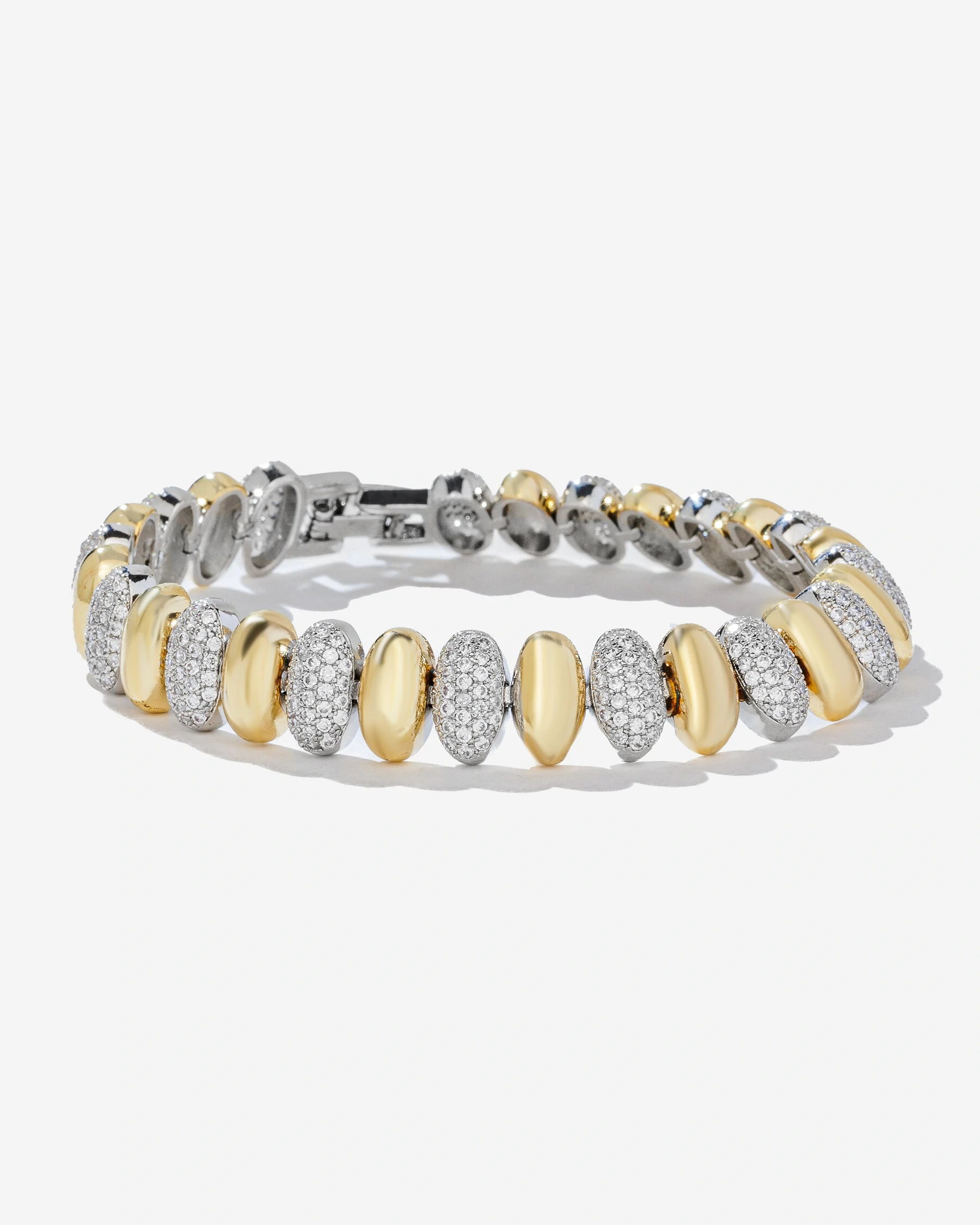 A elegância da corrente com pequenas formas estilizadas de amêndoas, em uma composição alternada de formas lisas, em banho de ouro 18k, e em Pavê de micro zircônias cristais,em banho de ródio branco, transforma a Pulseira Duo Nut em um acessório repleto de estilo e muito refinamento..