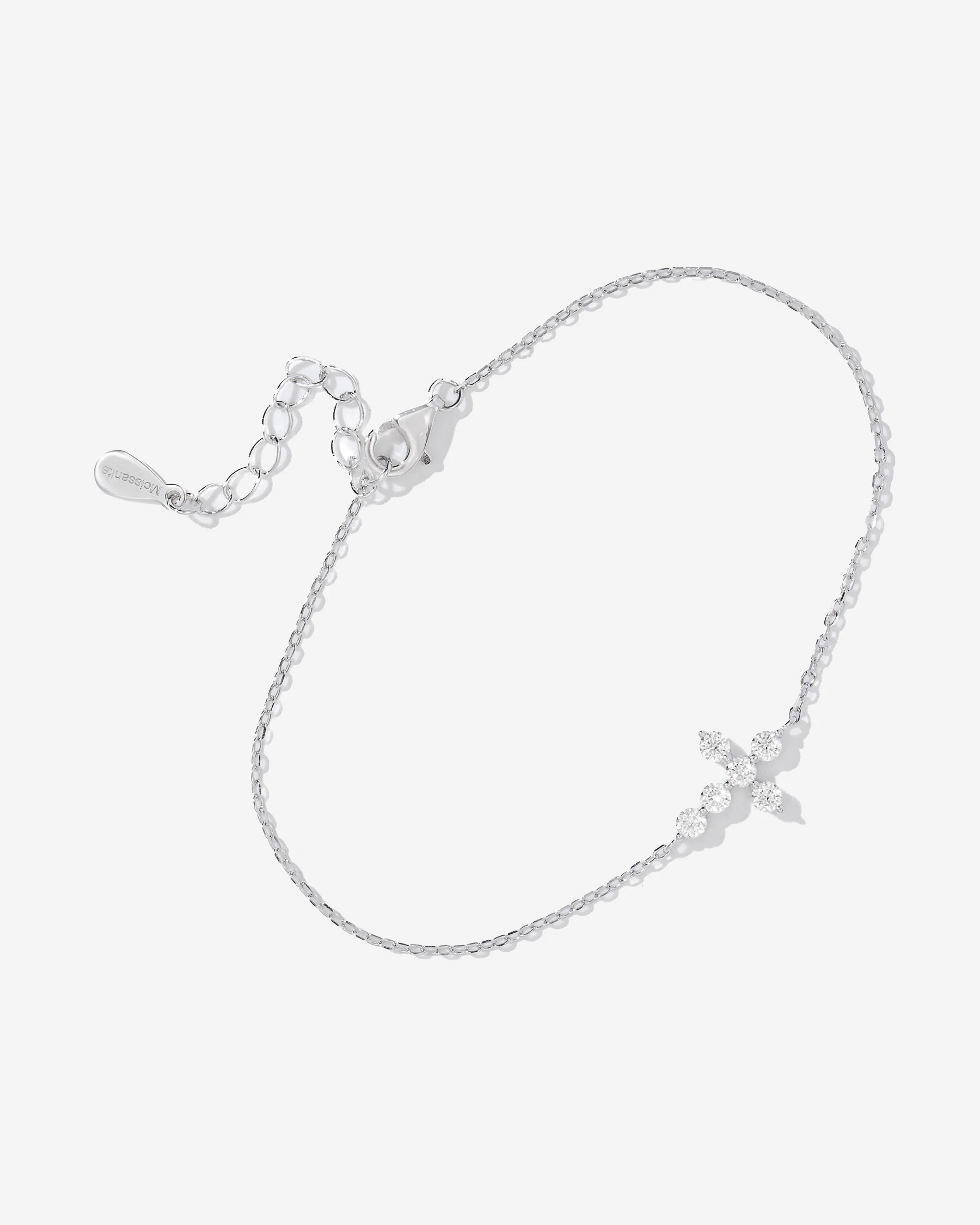 A delicadeza da corrente de pequenos elos, sustenta com elegância uma pequena cruz trabalhada em Moissanites, confeccionada em prata 925 e banho de ródio branco. É um modelo de extrema beleza que simboliza a fé de maneira discreta, com reflexos intensos e únicos, perfeitos para coroarem com perfeição esta adoravel joia.