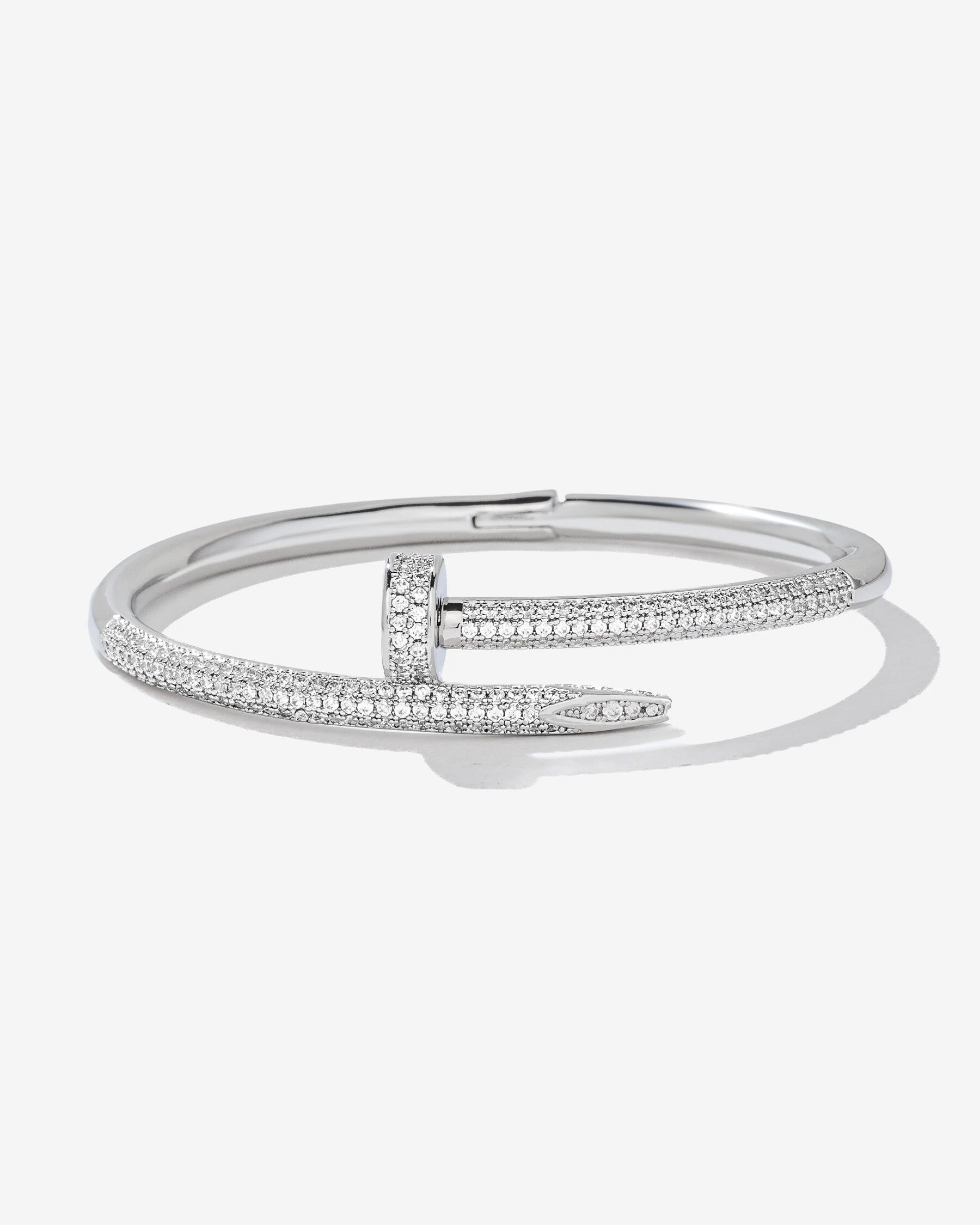 A beleza do Bracelete Prego, está em seu formato inspirado na alta joalheria. Cravejado com zirconias e em banho de Ródio, seu estilo modernista e elegante, cria um acessário indispensável para compor looks atraentes e com muita personalidade.