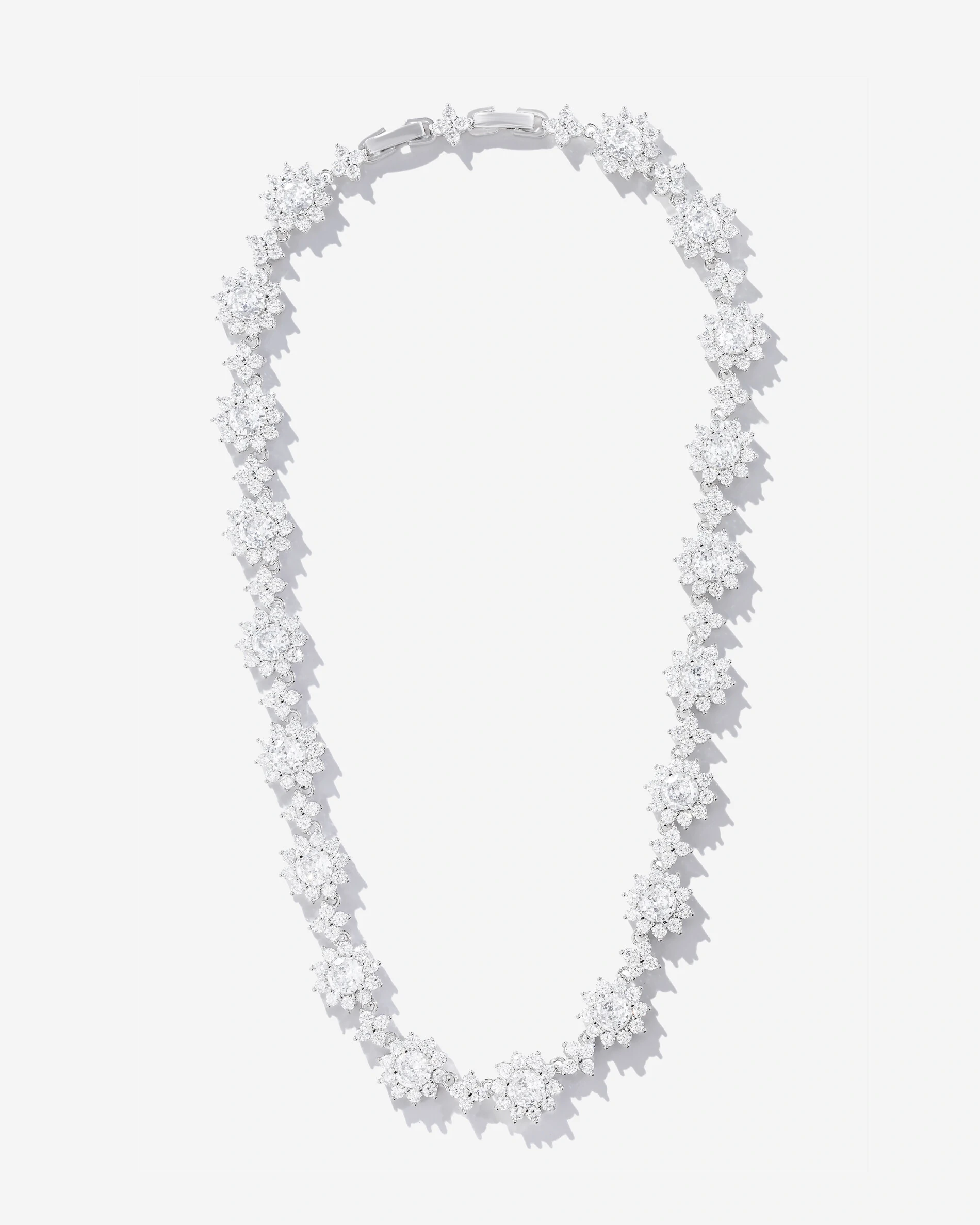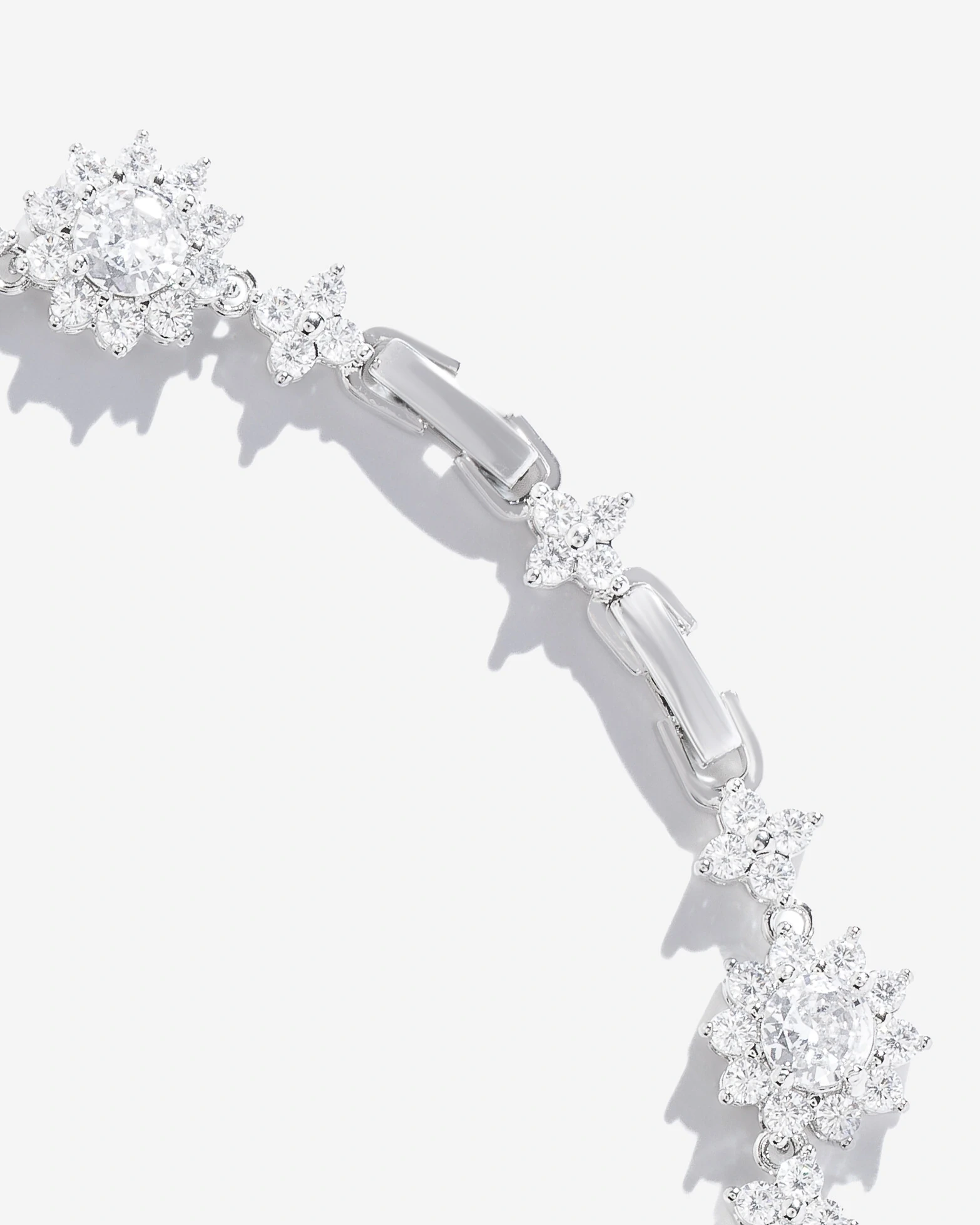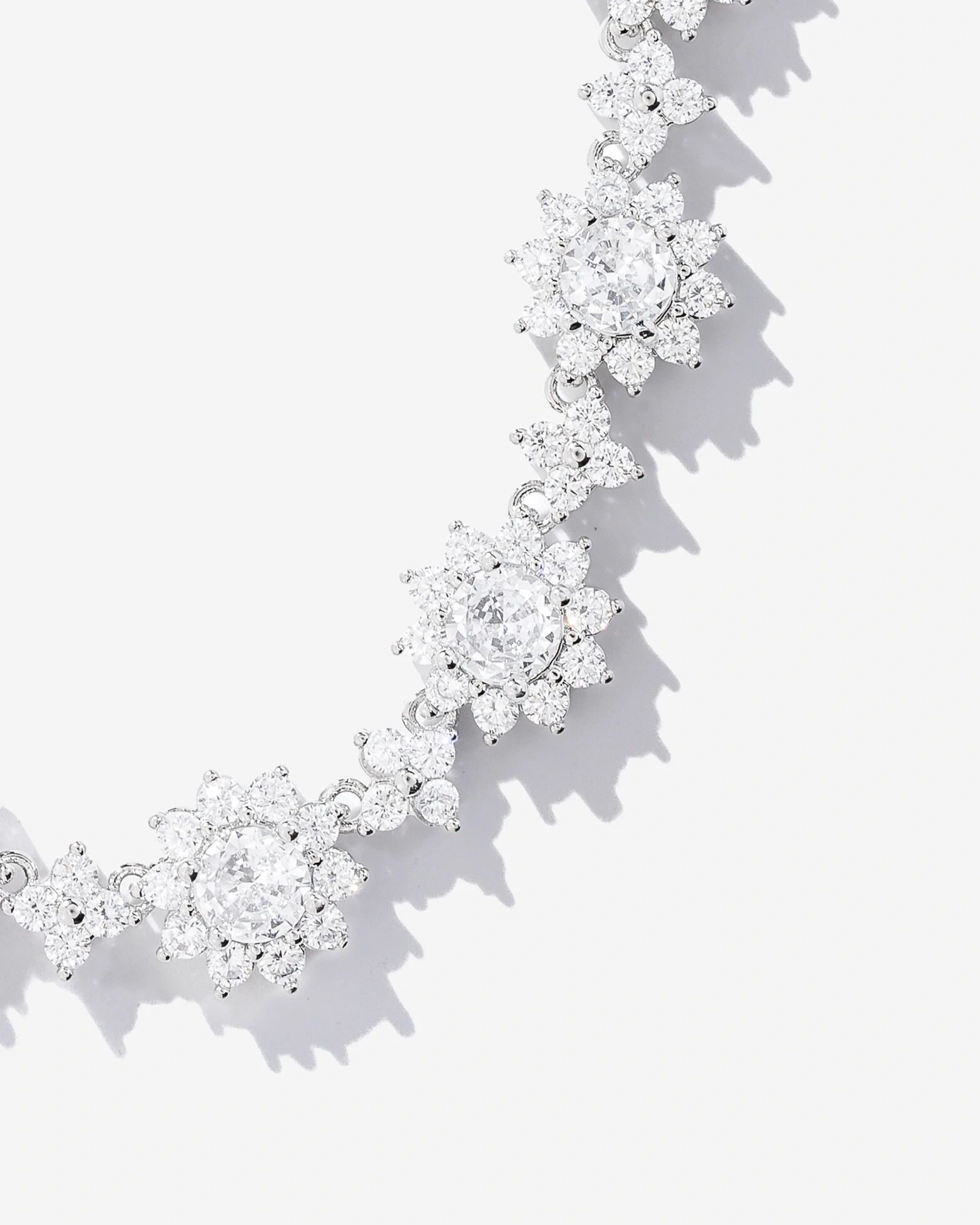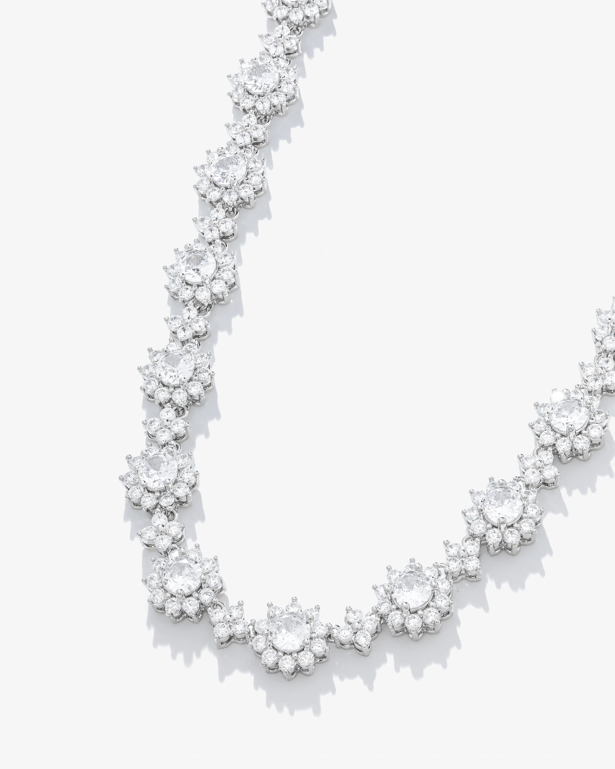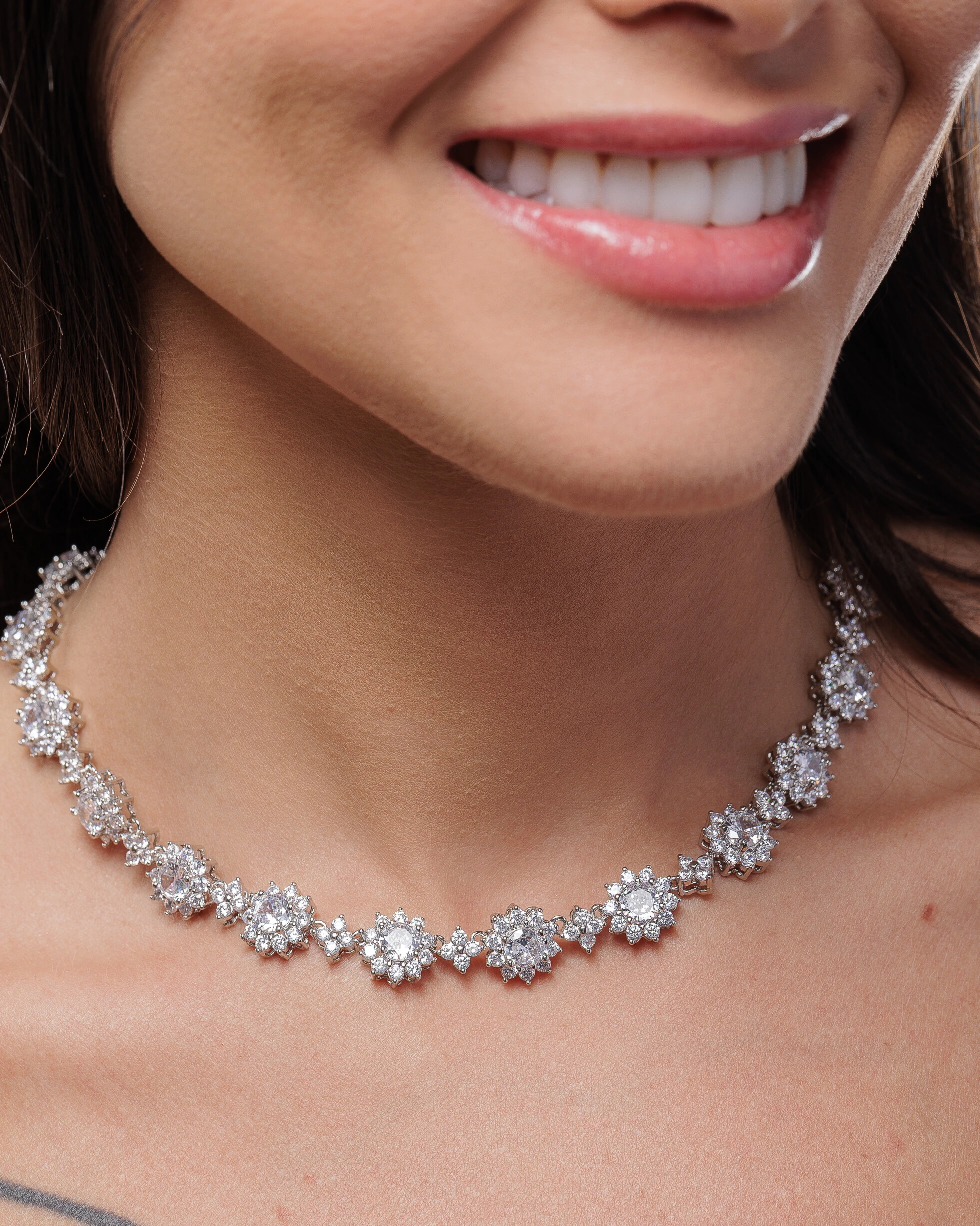 Com uma maravilhosa composição de flores em zircônias cristais em lapidação brilhante. que recobrem toda a corrente da Riviera Angel, em banho de ródio branco, criando um acessório de extrema elegância que transmite um visual romantico e marcante.