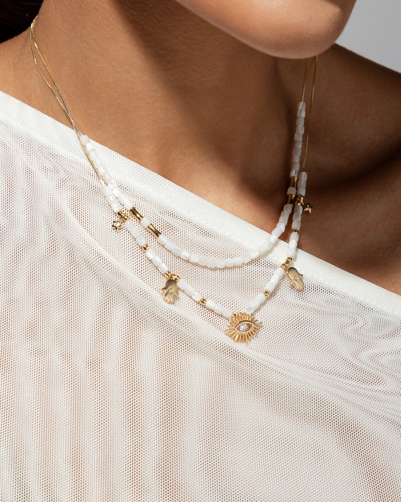 O Colar Summer, em banho de ouro 18k, combina em sua charmosa corrente uma combinação de pingentes místicos, criando uma peça luminosa e repleta de energia. Disponíveis com corrente de canutilhos de madrepérola e de cristais búlgaros.