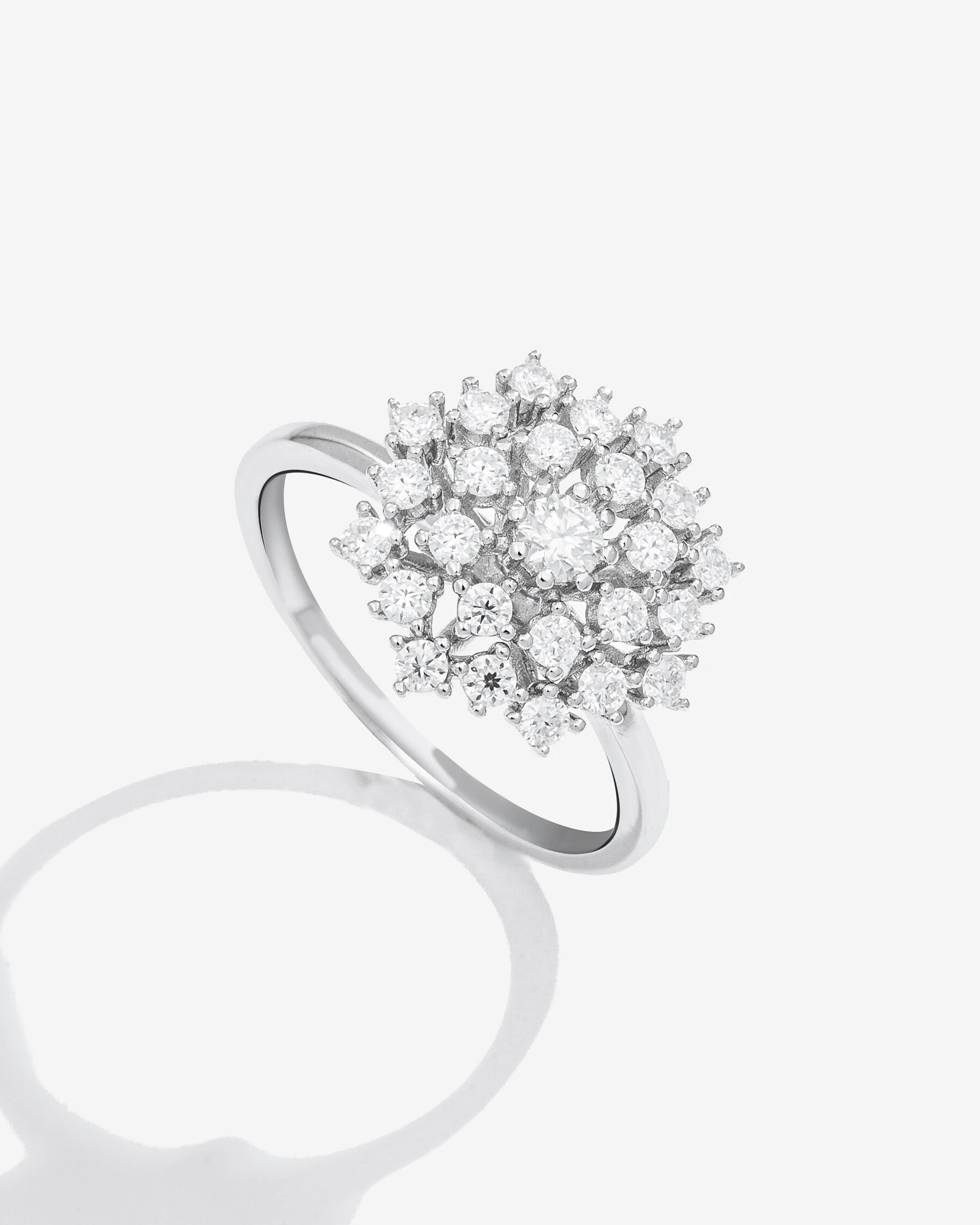Com uma composição de moissanites cuidadosamente posicionadas, este anel cria um efeito de flor cintilante, iluminando qualquer look. Uma peça clássica, versátil e indispensável para quem valoriza acessórios refinados.