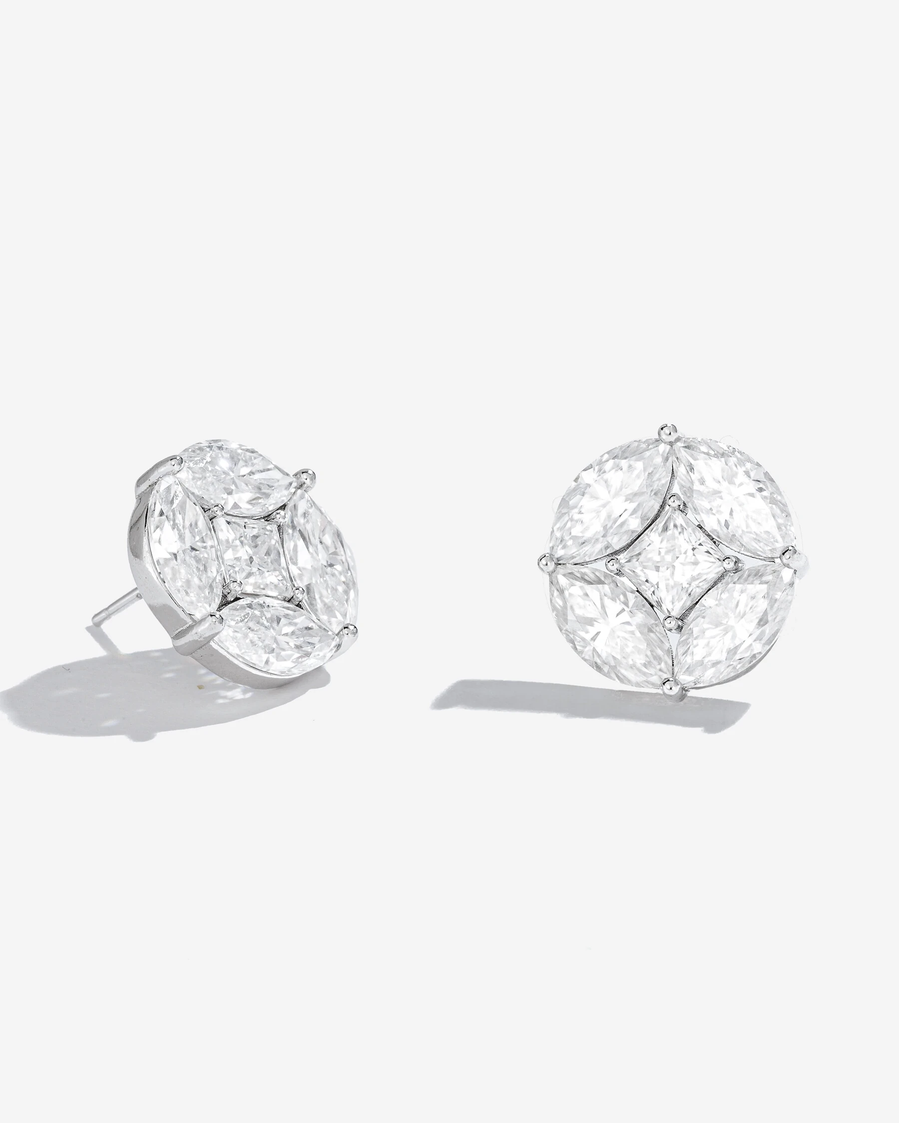 A elegância atemporal deste modelo de brinco, surpreende com o design que une diferentes lapidações de fascinantes Moissanites, cujos reflexos amarelados e um brilho excepcional, intensificam a beleza desta encantadora joia confeccionada em prata 925 e banho de ródio branco.