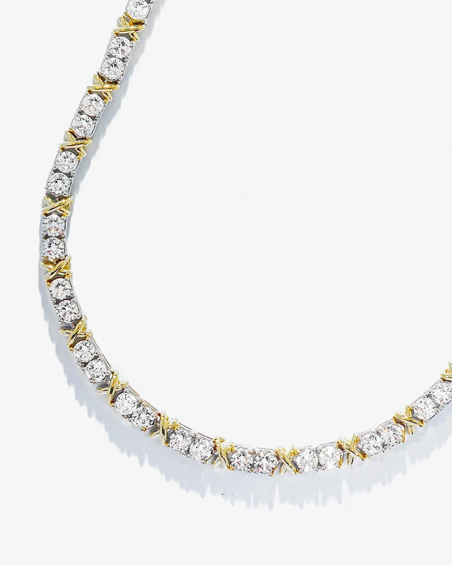 Colar Riviera Celeste se destaca por seu elegante design que combina a beleza do duo de banhos e a composição de Zircônias Cristais de 5mm. Com banho de ródio branco e intercalado por um X em banho de ouro 18k.