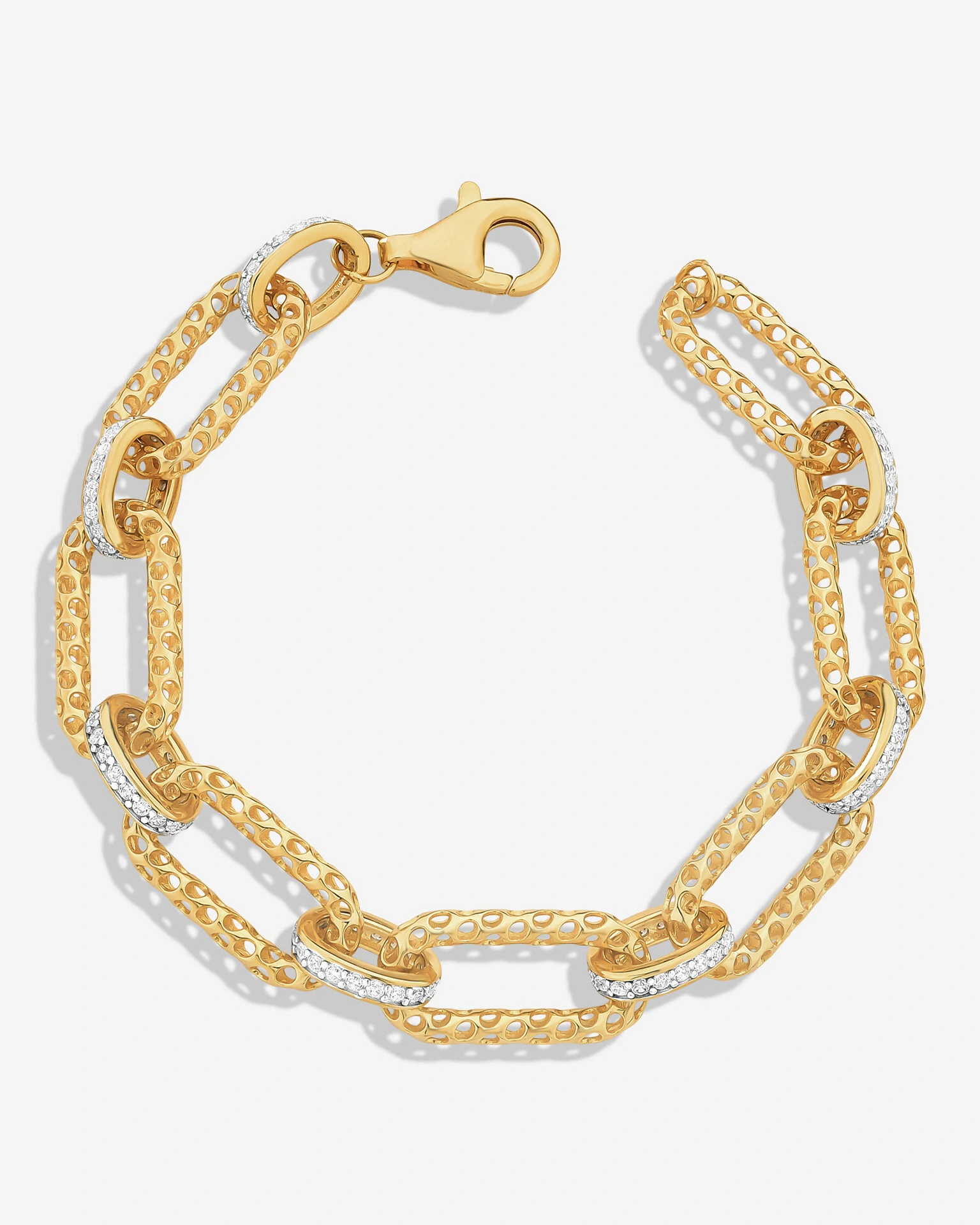 A corrente de elos furadinhos se combina com a elegância de pequenos aros trabalhados em zircônias cristais, pequenos detalhes que deslumbram noa Pulseira Holes, joia confeccionada em prata 925 e banho de ouro 18k..