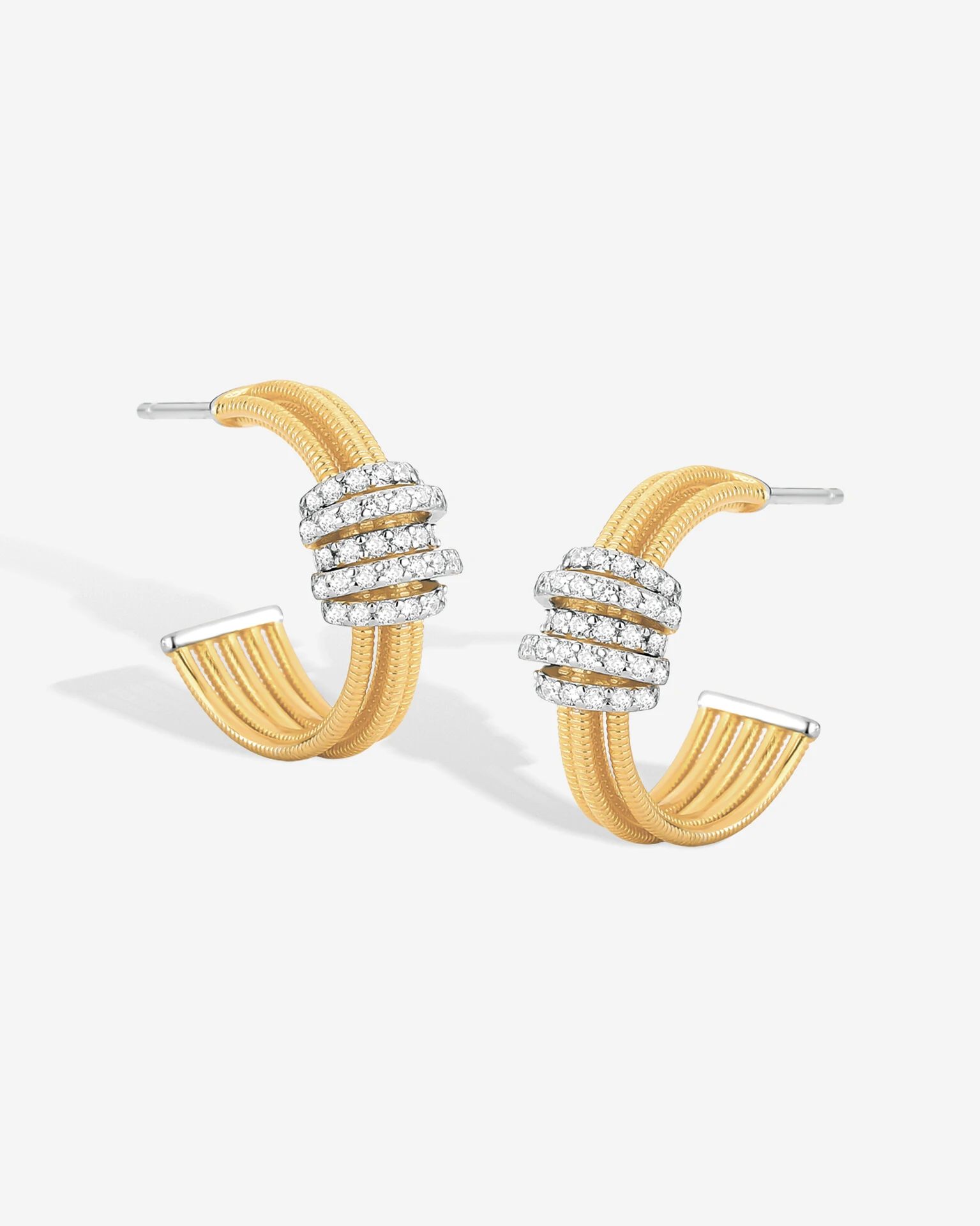 Com design de linhas suaves e textura canelada, o Brinco Cora exibe elegância em pequenos detalhes; a delicada semi argola em banho de ouro 18k, contrasta vivamente com 5 argolinhas caneteadas em ródio branco e repletas do brilho intenso de zircônias cristais. O resultado é um modelo sutilmente divino, que proporcionará muito mais refinamento e glamour ao seu visual.