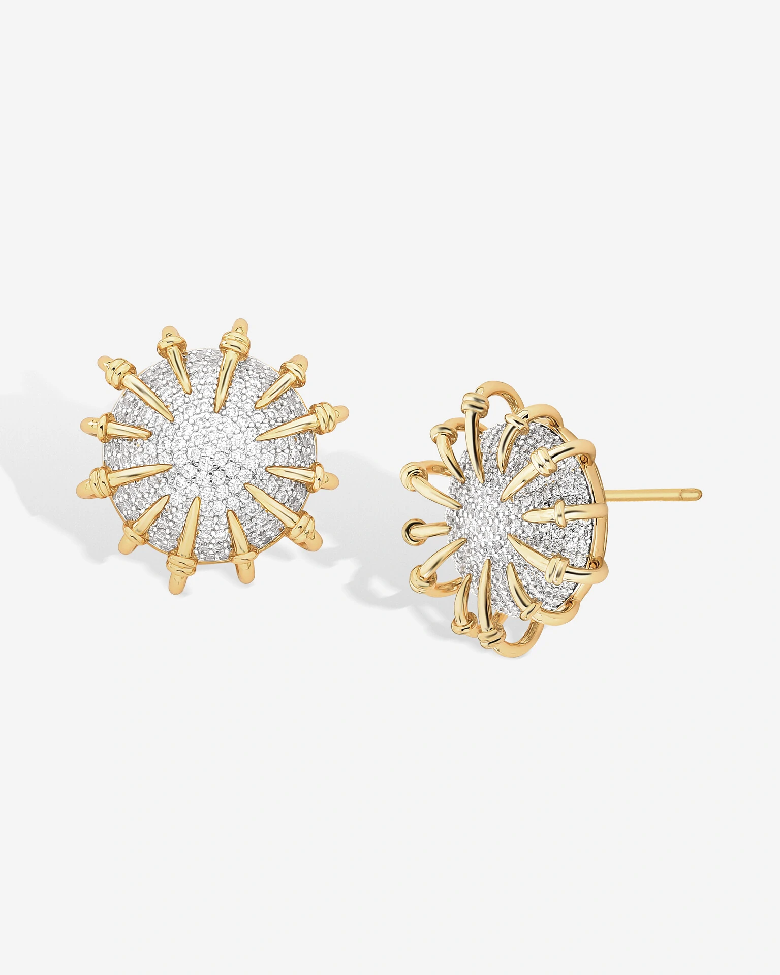 Brinco com design sofisticado, composto por base microcravejada de zircônias e detalhes em garras em banho de Ouro 18k que criam um efeito de brilho e textura únicos.