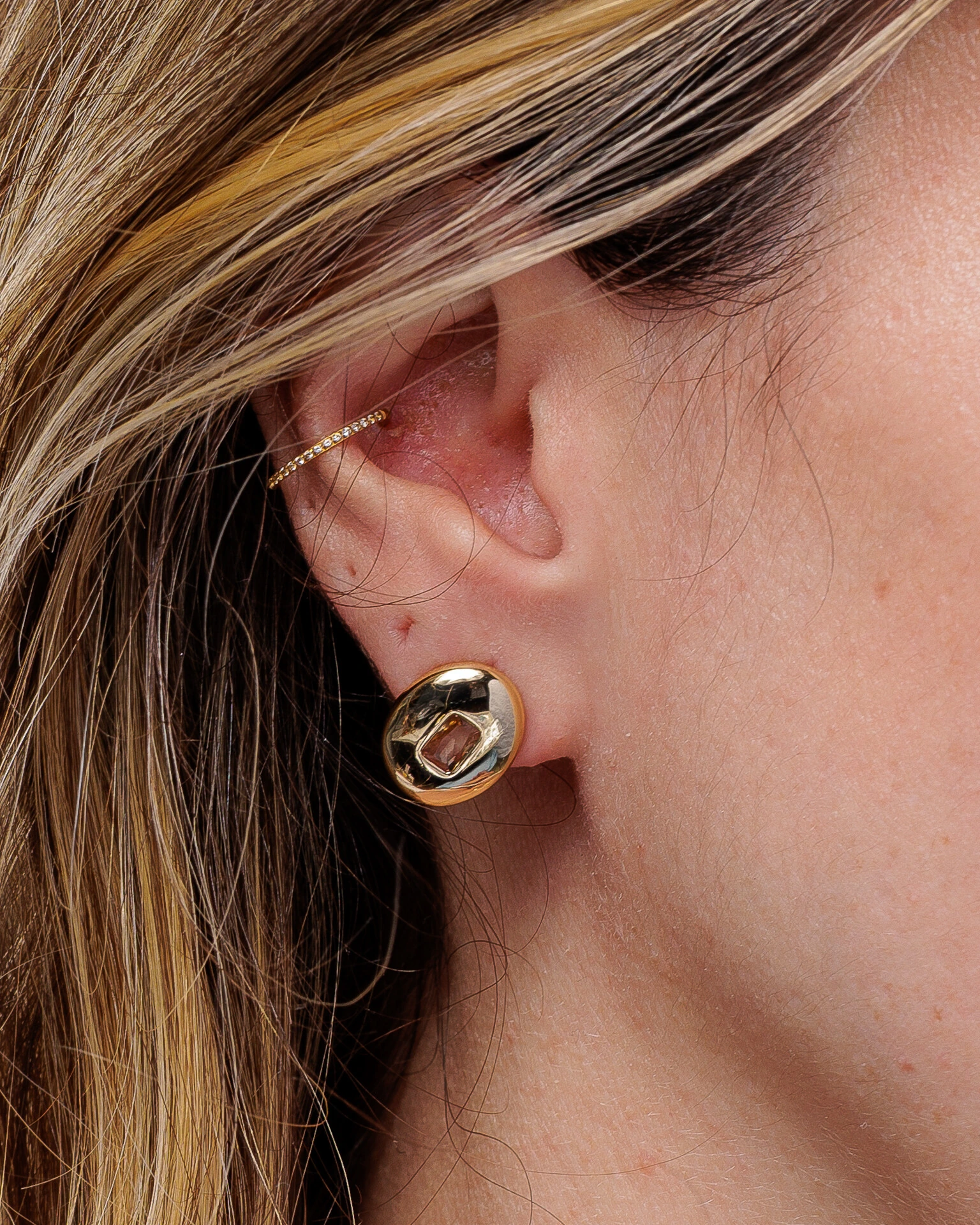 Brinco oval em banho de Ouro 18k, com pedra central retangular. Uma peça elegante e minimalista, perfeita para quem gosta de brilho discreto e design sofisticado.