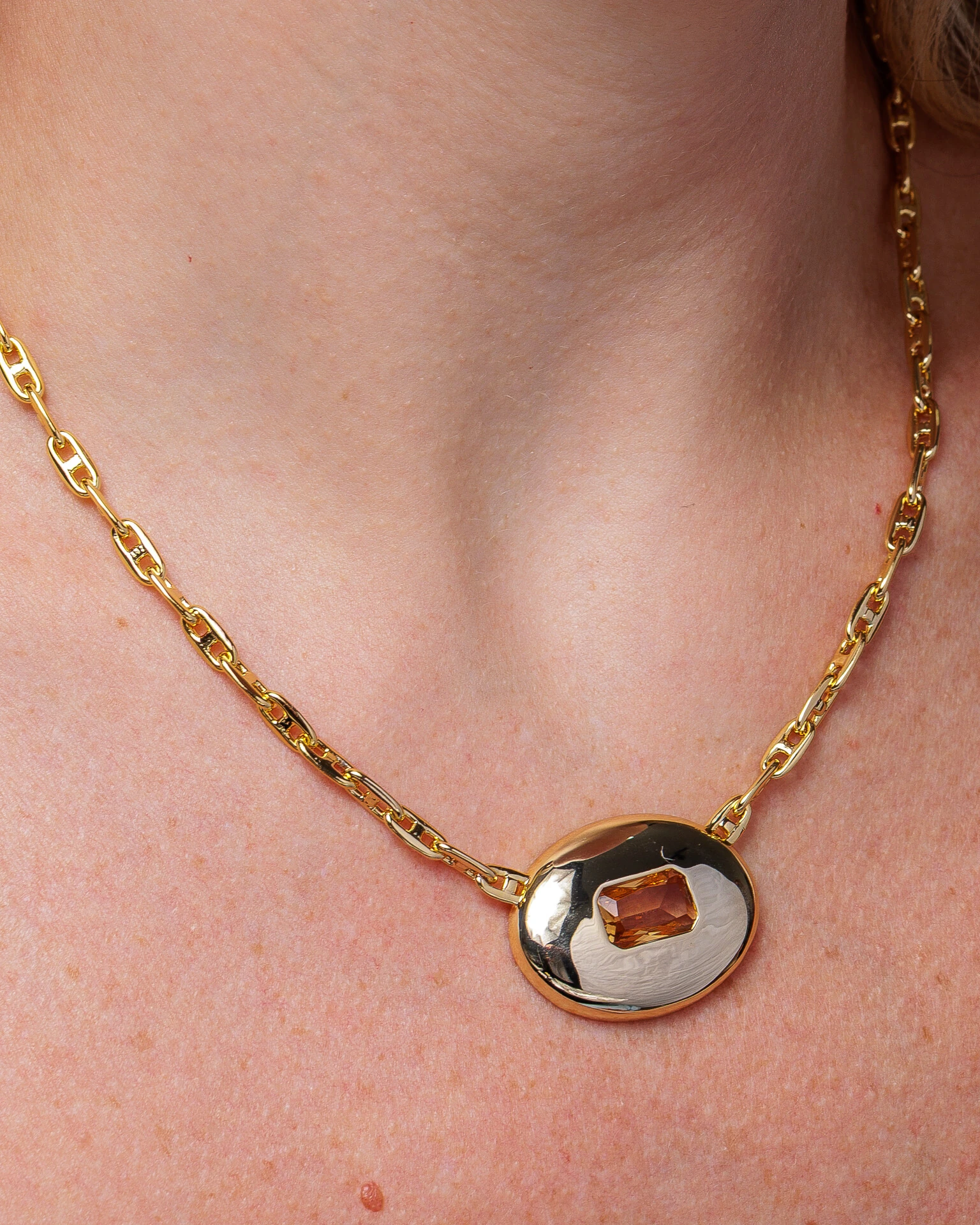Colar com pingente oval em banho de Ouro 18k, com pedra central retangular. Uma peça elegante e minimalista, perfeita para quem gosta de brilho discreto e design sofisticado.