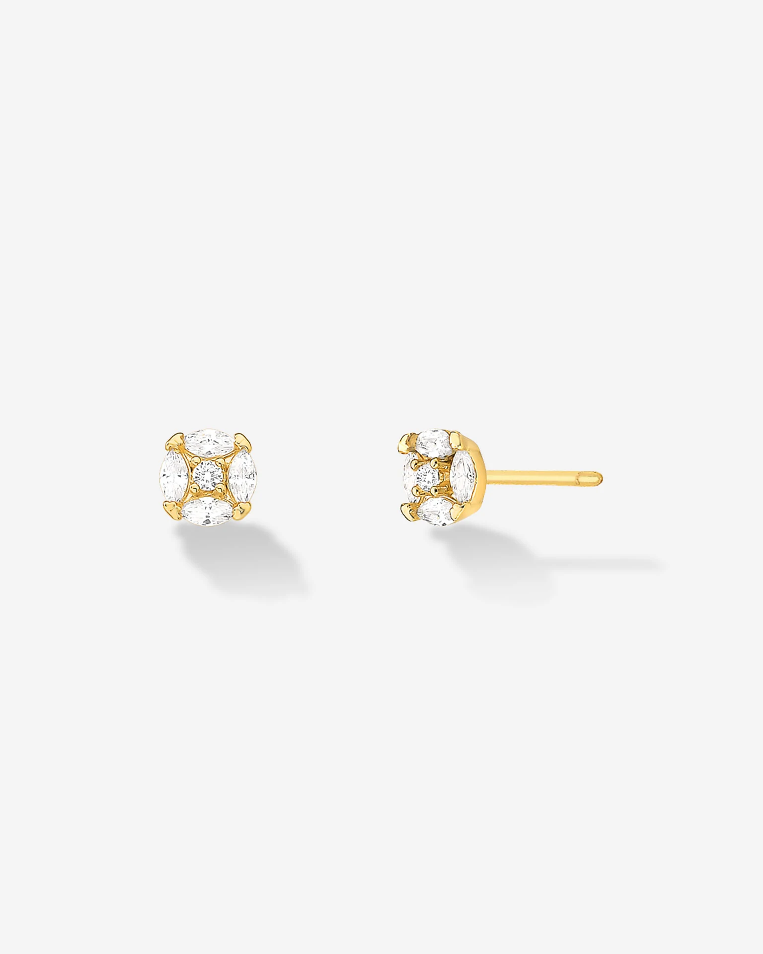 O Brinco Donna apresenta uma elegante composição de zircônias na clássica lapidação Navete, sua cravação cria o design de uma pequena flor.