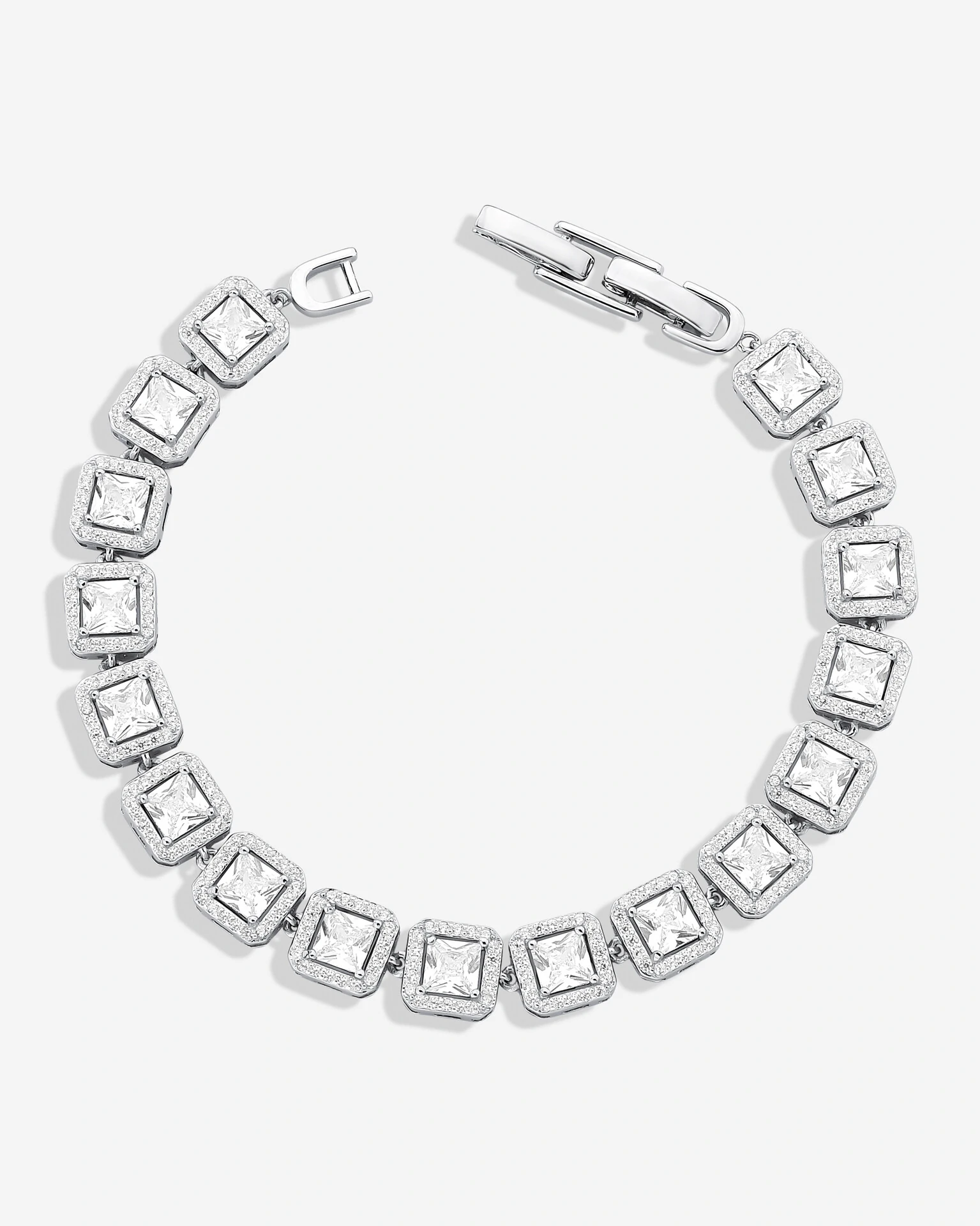 Pulseira Riviera em banho de Ródio Branco e zircônias cristais em lapidação quadrada com delicada moldura cravejada. O design clássico ganha força pelo brilho e pelo encaixe perfeito das formas. É perfeita para usar sozinha como destaque ou em composição com outras pulseiras, trazendo elegância imediata ao visual.