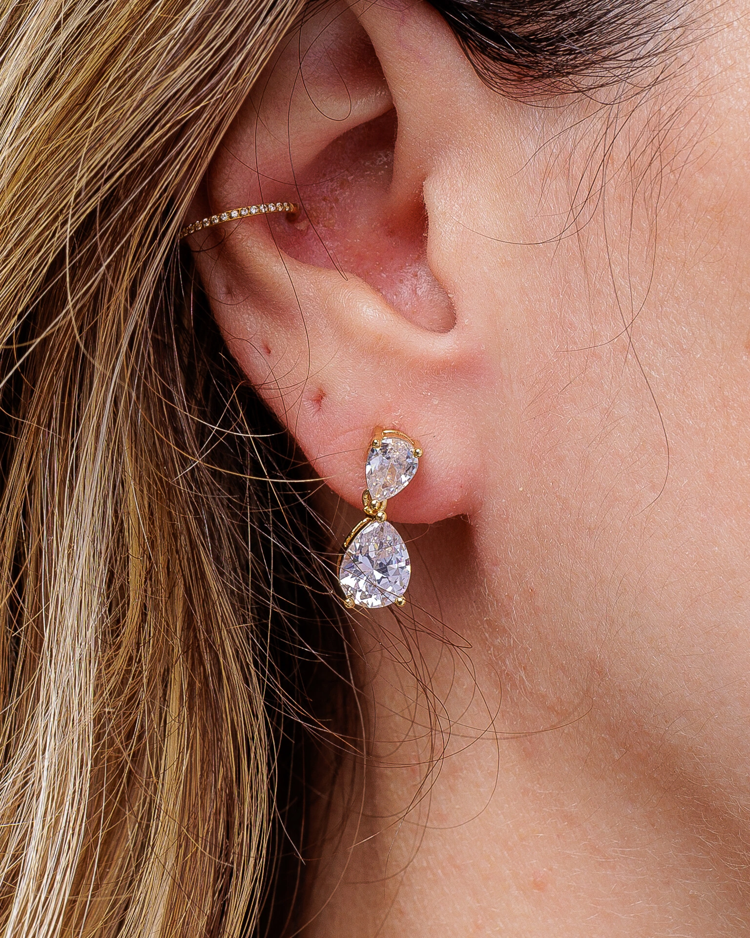 Brinco clássico com zircônias em lapidação gota, que garante brilho intenso e elegância atemporal. Uma peça sofisticada, perfeita para valorizar produções refinadas ou dar um toque especial ao look do dia a dia.