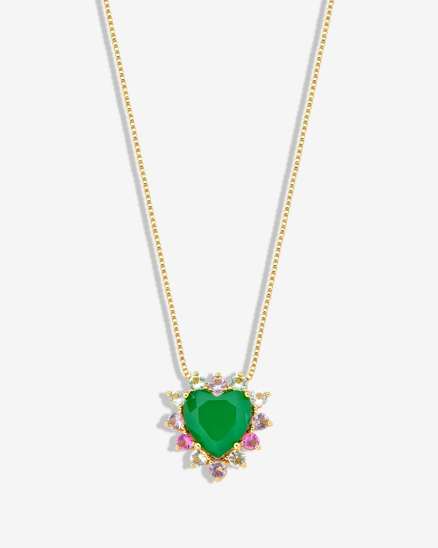 Colar Coração Esmeralda, em banho de Ouro 18k, com o uma corrente fina que carrega um pingente em formato de coração.