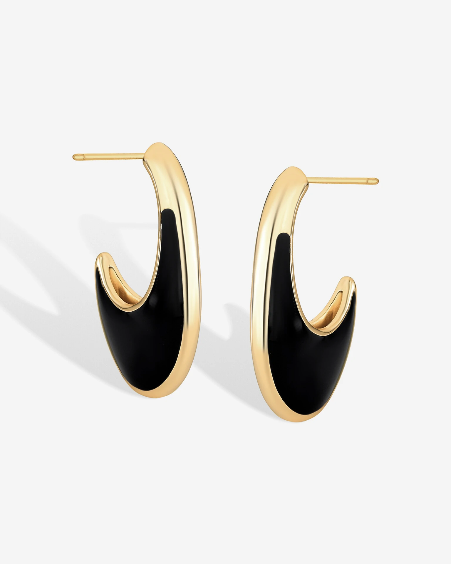 A união perfeita entre o minimalismo e o luxo. Esta meia argola destaca-se pelo formato escultural de gancho e pelo contraste entre o brilho dourado do banho de ouro 18k e a esmaltação na cor preta, que resultam em refinamento e bom gosto.