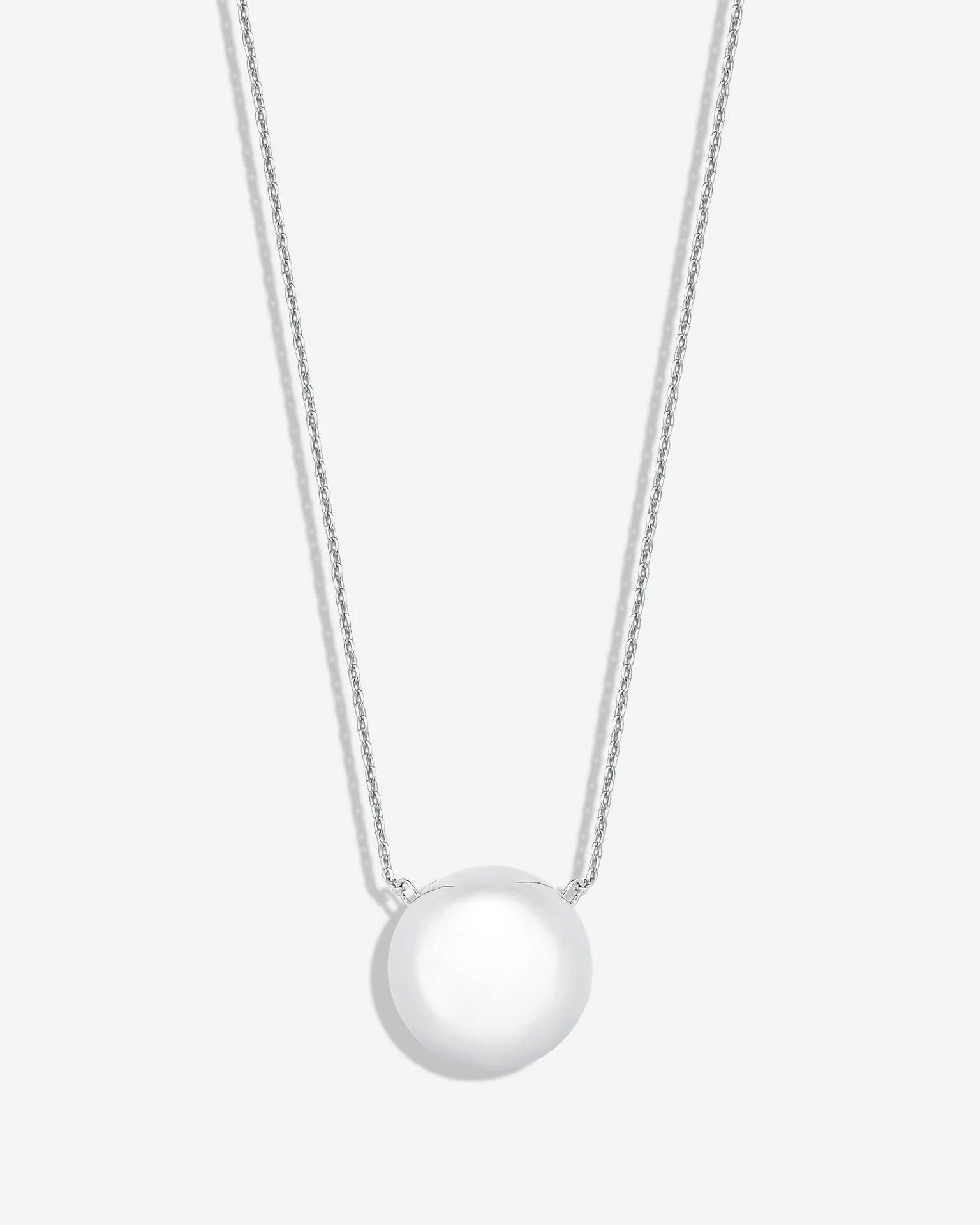 O minimalismo em sua forma mais pura. Este colar apresenta um pingente esférico com banho de ródio branco e acabamento de alto brilho. A corrente delicada contrasta perfeitamente com o peso visual da esfera, criando um visual contemporâneo e limpo. Uma peça essencial para quem ama acessórios geométricos.