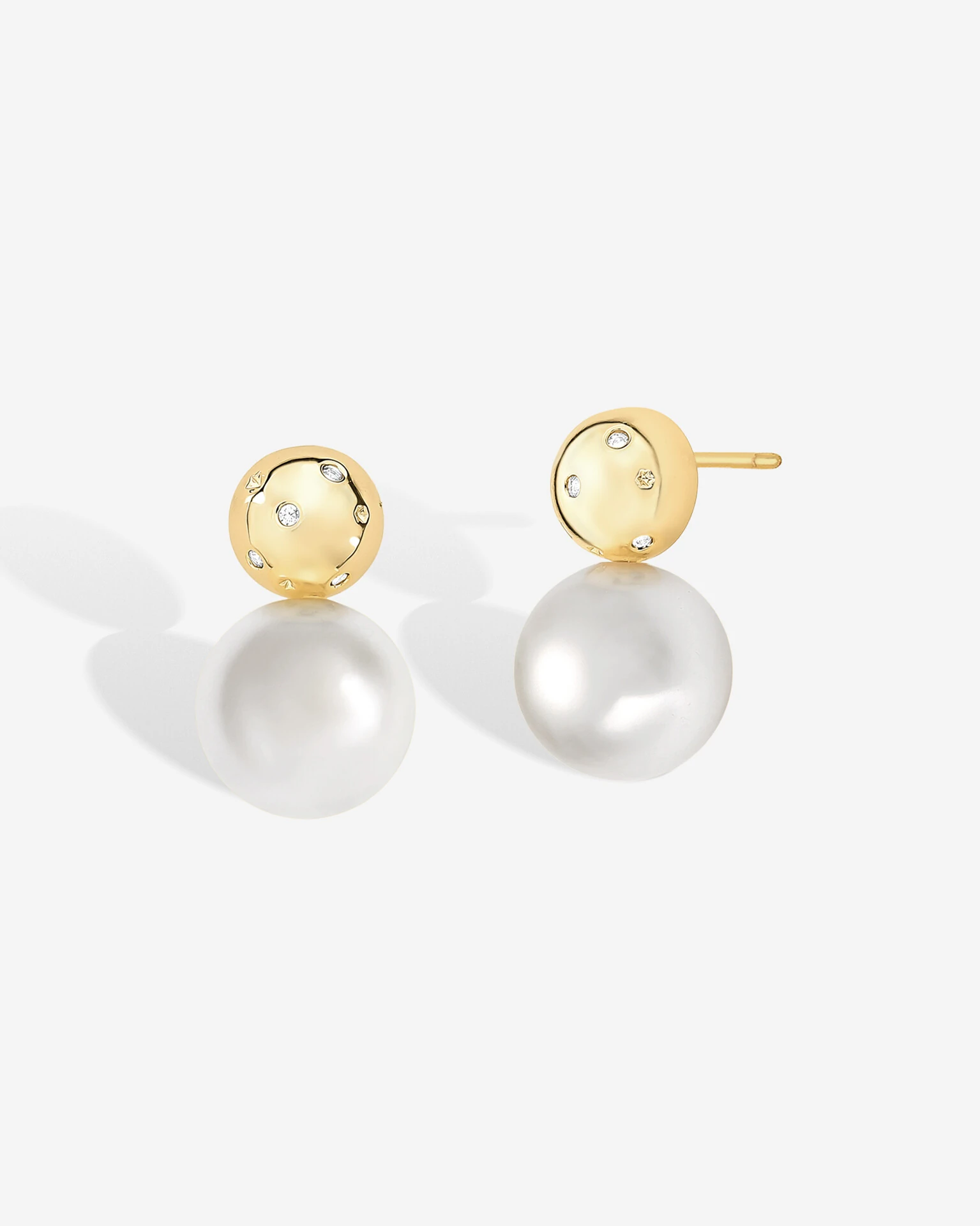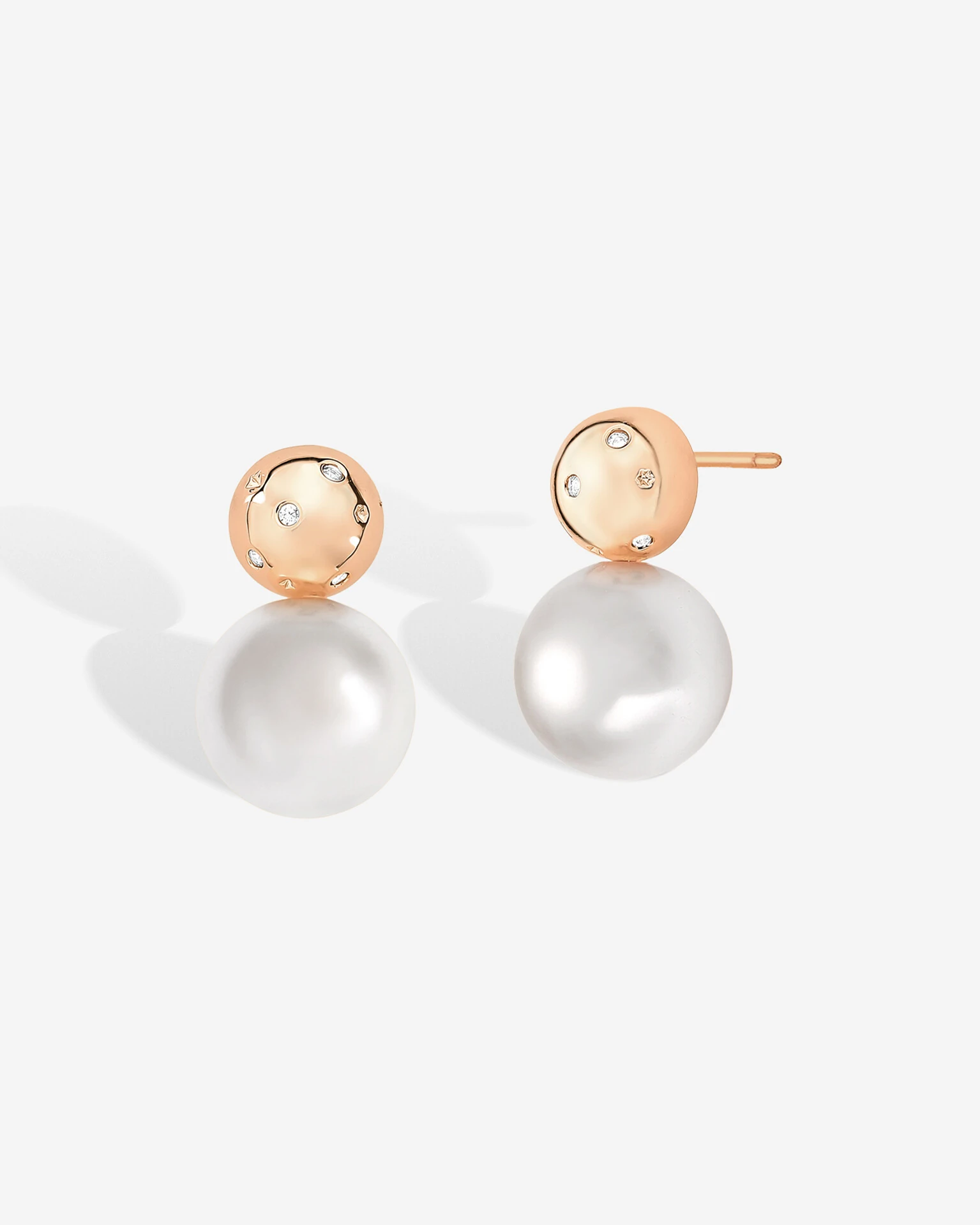 A união de duas formas esféricas envolvem o Brinco Shanti, com brilhos sutilmente elegantes produzidos por delicados pontos de luz em zircônias cristais e os reflexos nacarados da maxi pérola Shell. Modelo disponível em banho: de ouro 18k e ouro rosé.