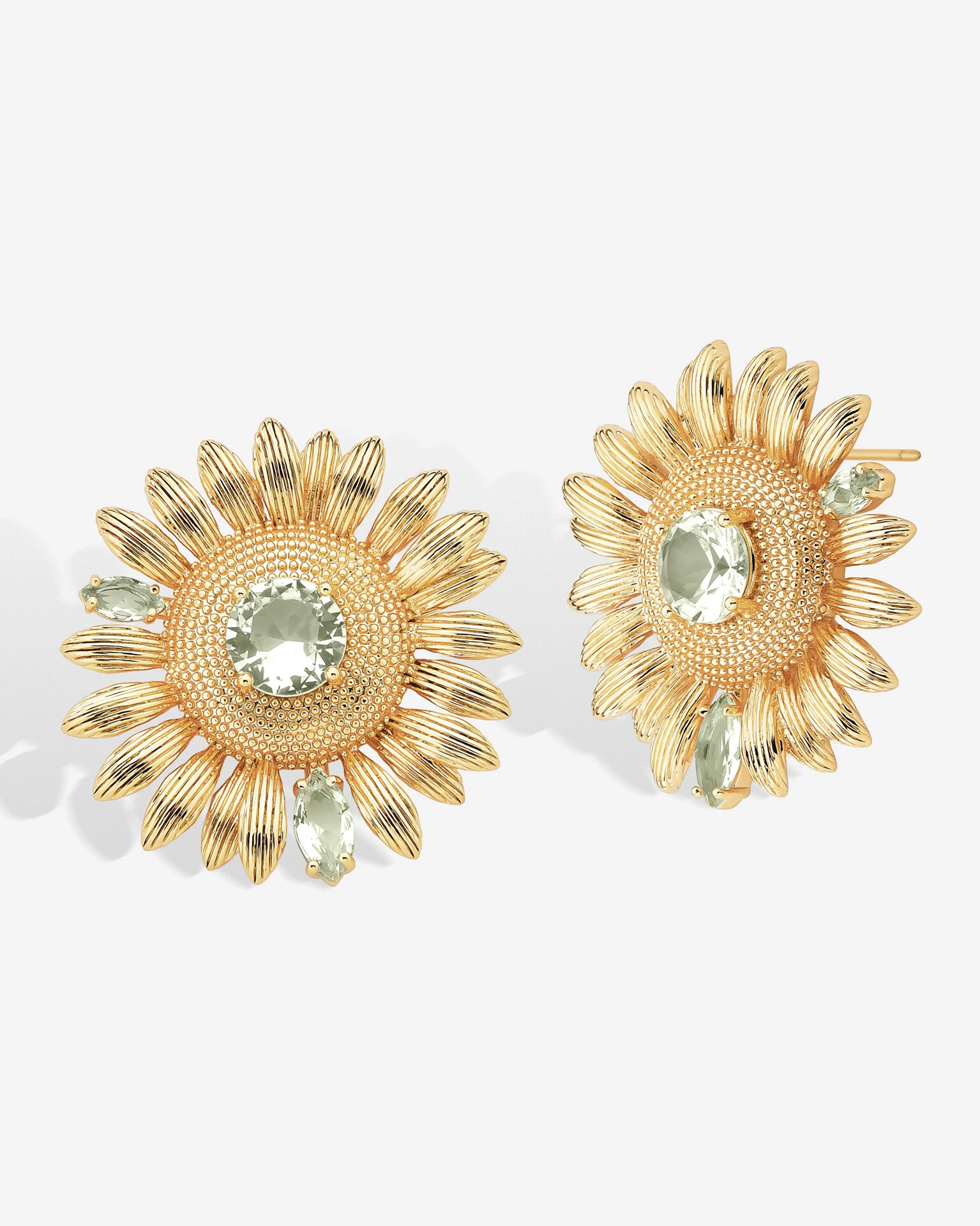 A beleza do Brinco Sunflower, está nas lindas e elegantes pétalas que se harmonizam delicadamente por todo o aro de encontro com uma zirconia em Peridoto, formando um lindo girassol. Também disponível no tamanho M.