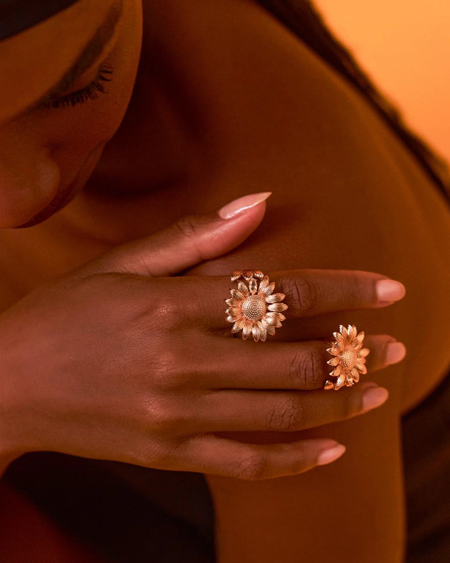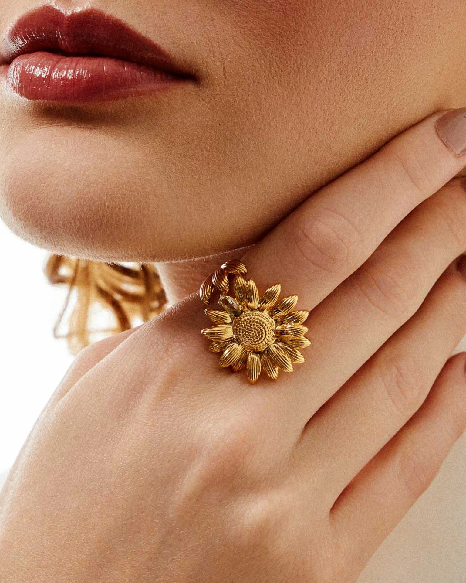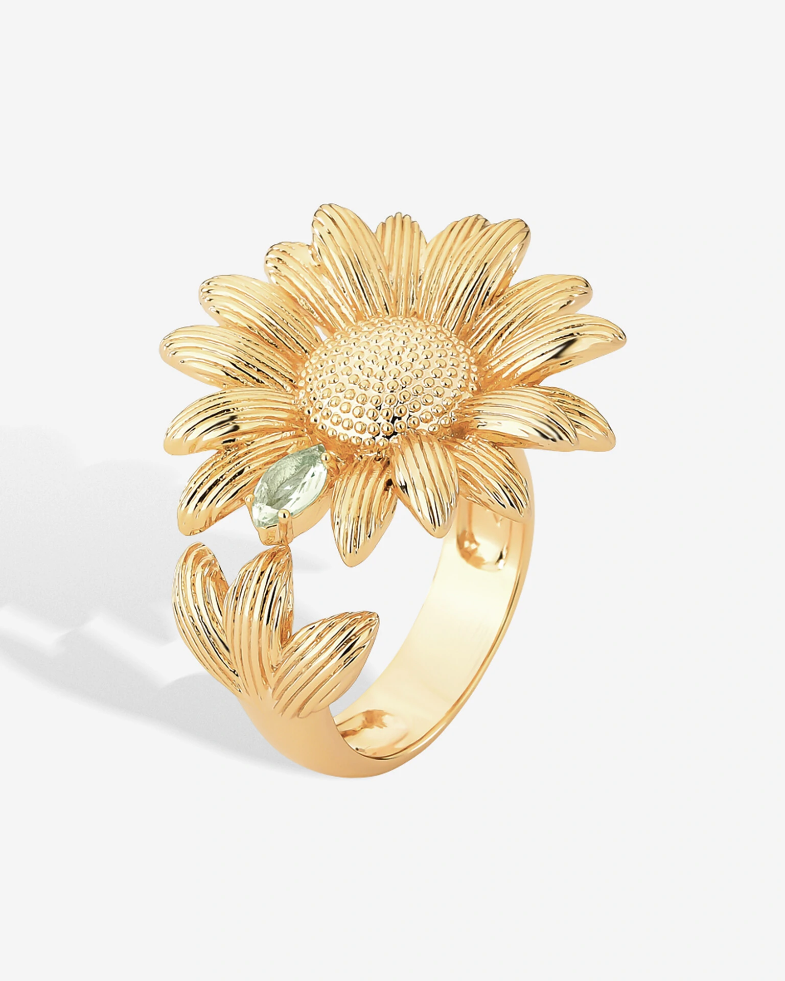 A beleza do Anel Sunflower, está nas lindas e elegantes pétalas que se harmonizam delicadamente por todo o aro de encontro com uma zirconia em Peridoto, formando um lindo girassol.