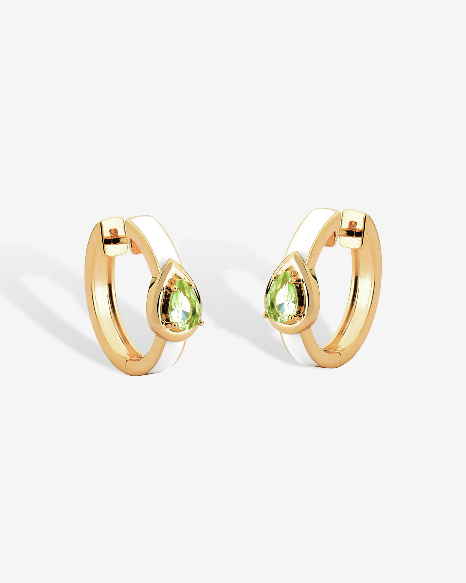 O equilíbrio perfeito entre o clássico e o moderno. Esta argola combina o acabamento dourado com um detalhe em esmalte branco, criando uma moldura sofisticada que realça o brilho intenso da gota central em Peridoto.