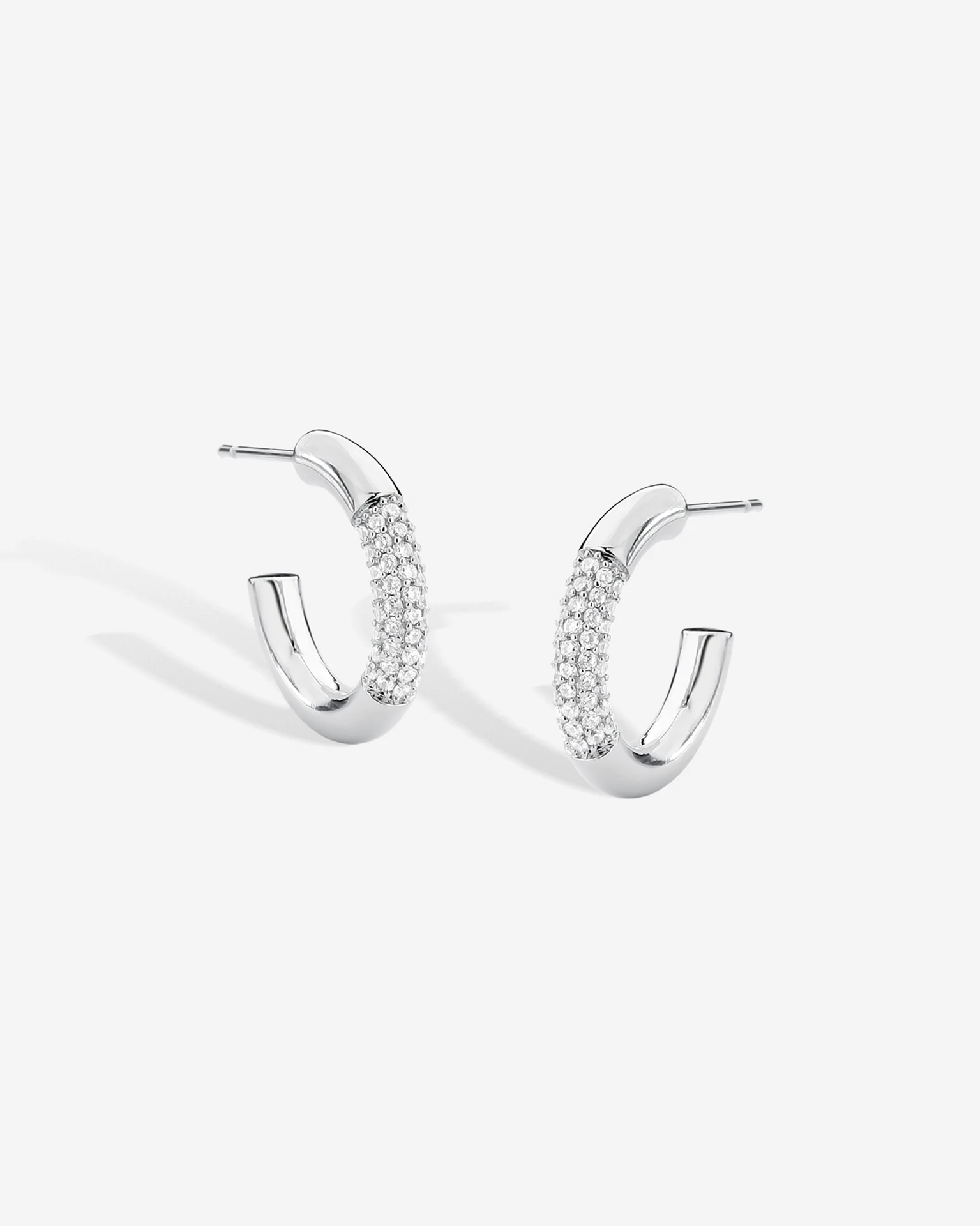 Brinco Meia Agola Mavie, em banho de ródio, e com design delicado a argola tem microzirconias cristais cravejadas no meio e em suas pontas são lisas.