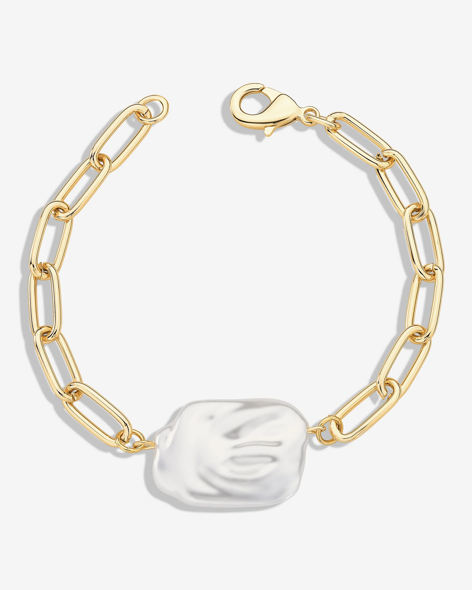 Pulseira Elos Pearl Organic conta com elos achatados em banho de ouro 18k e uma Perola Shell em formato organico. Uma peça elegante e feminina, que simboliza leveza e transformação, perfeita para iluminar o look com sofisticação e charme atemporal.