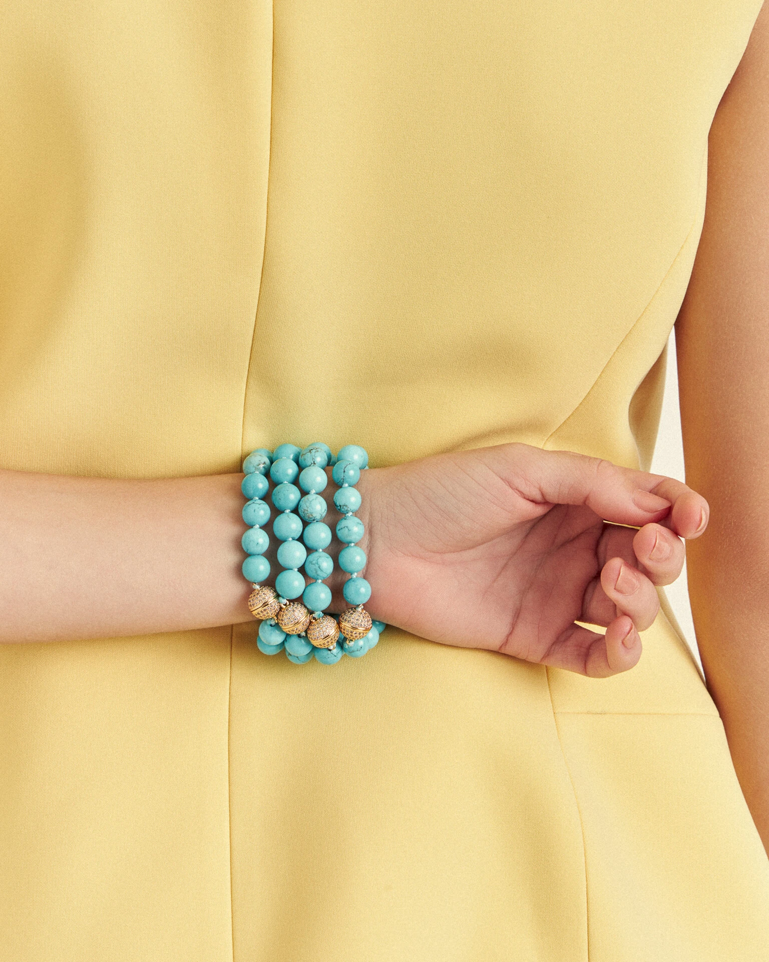 Pulseira Howlita Turquesa, formada por esferas turquesas, o toque de elegância é dado também pelo pequeno detalhe em seu fecho de imã em banho de ouro 18k.