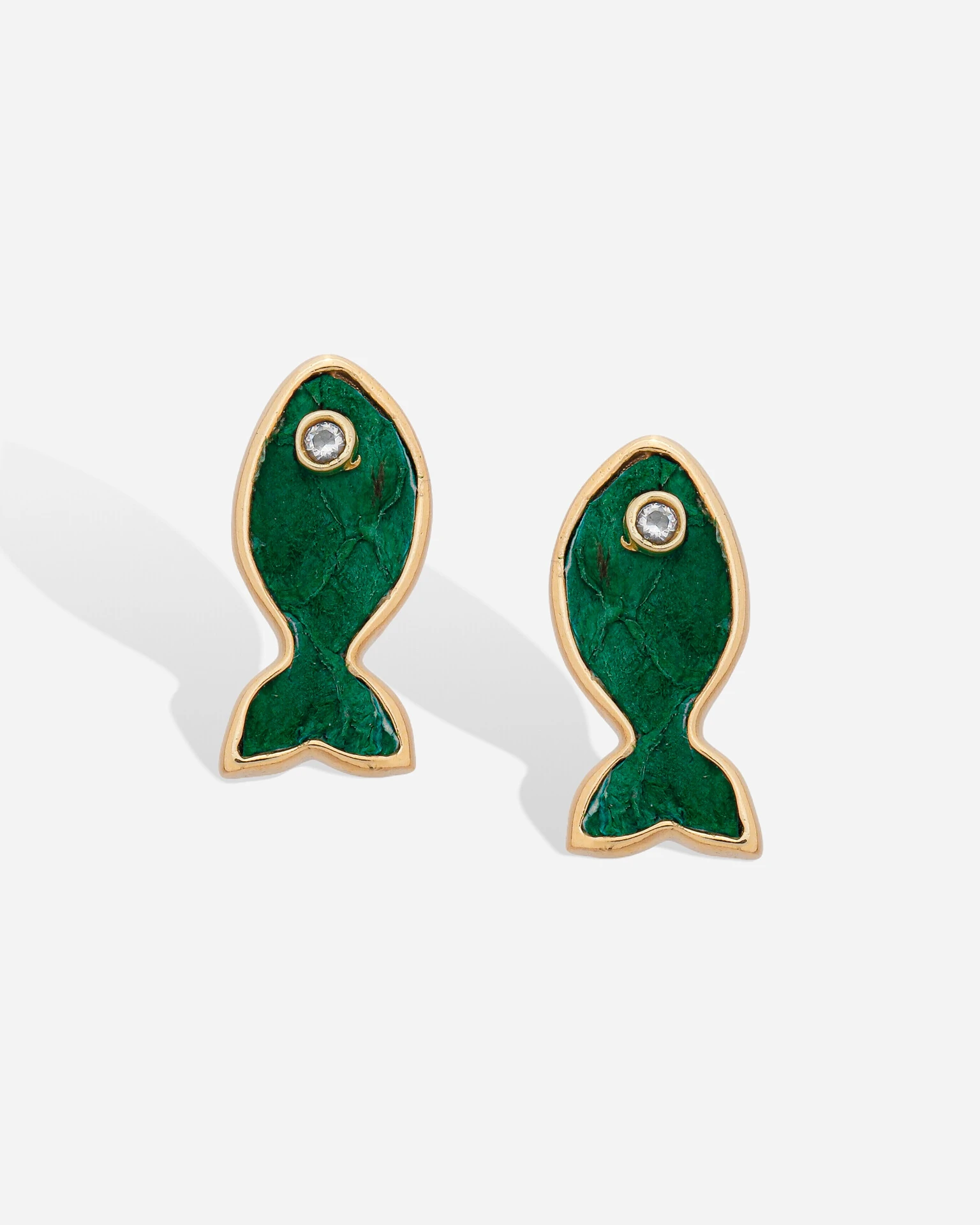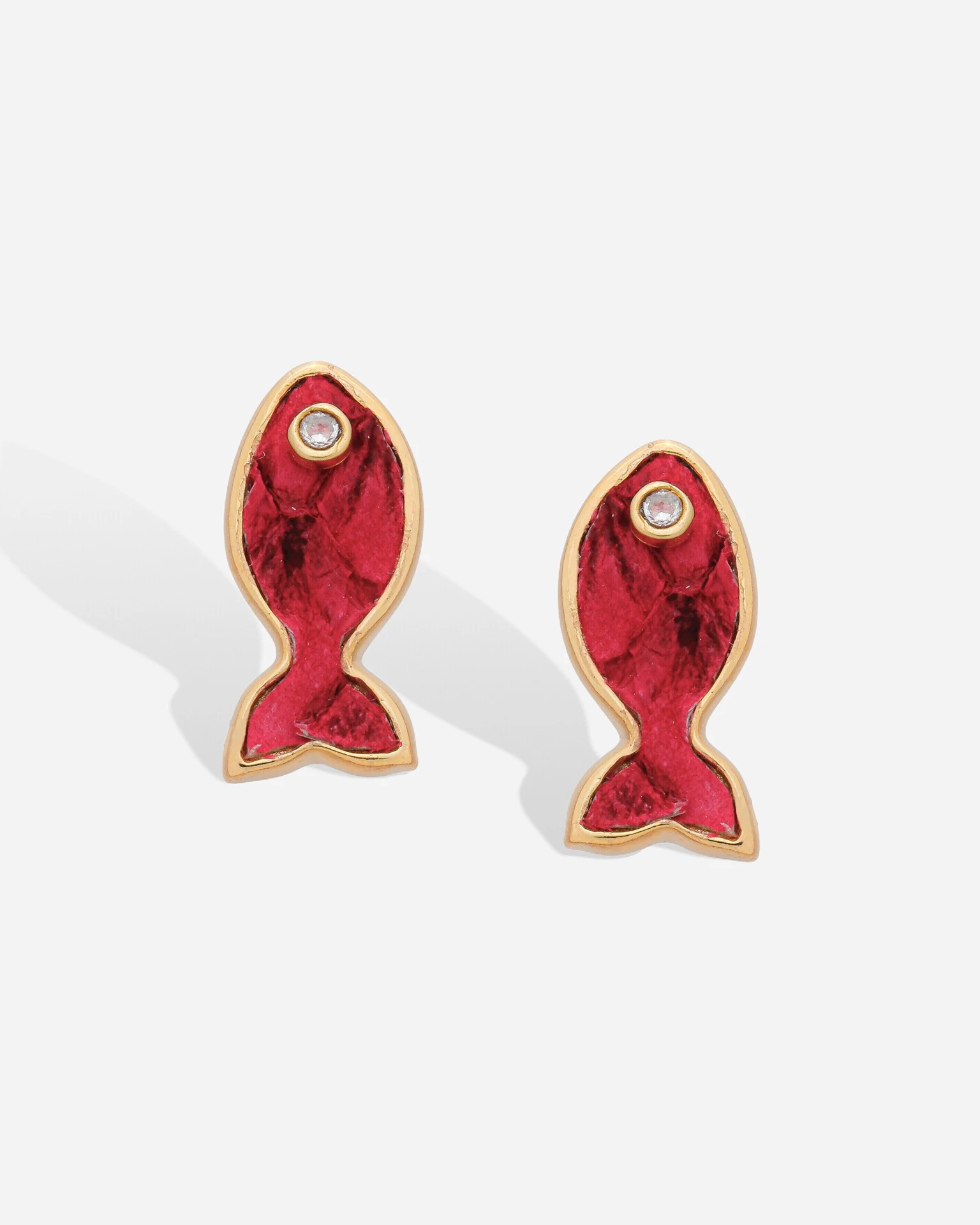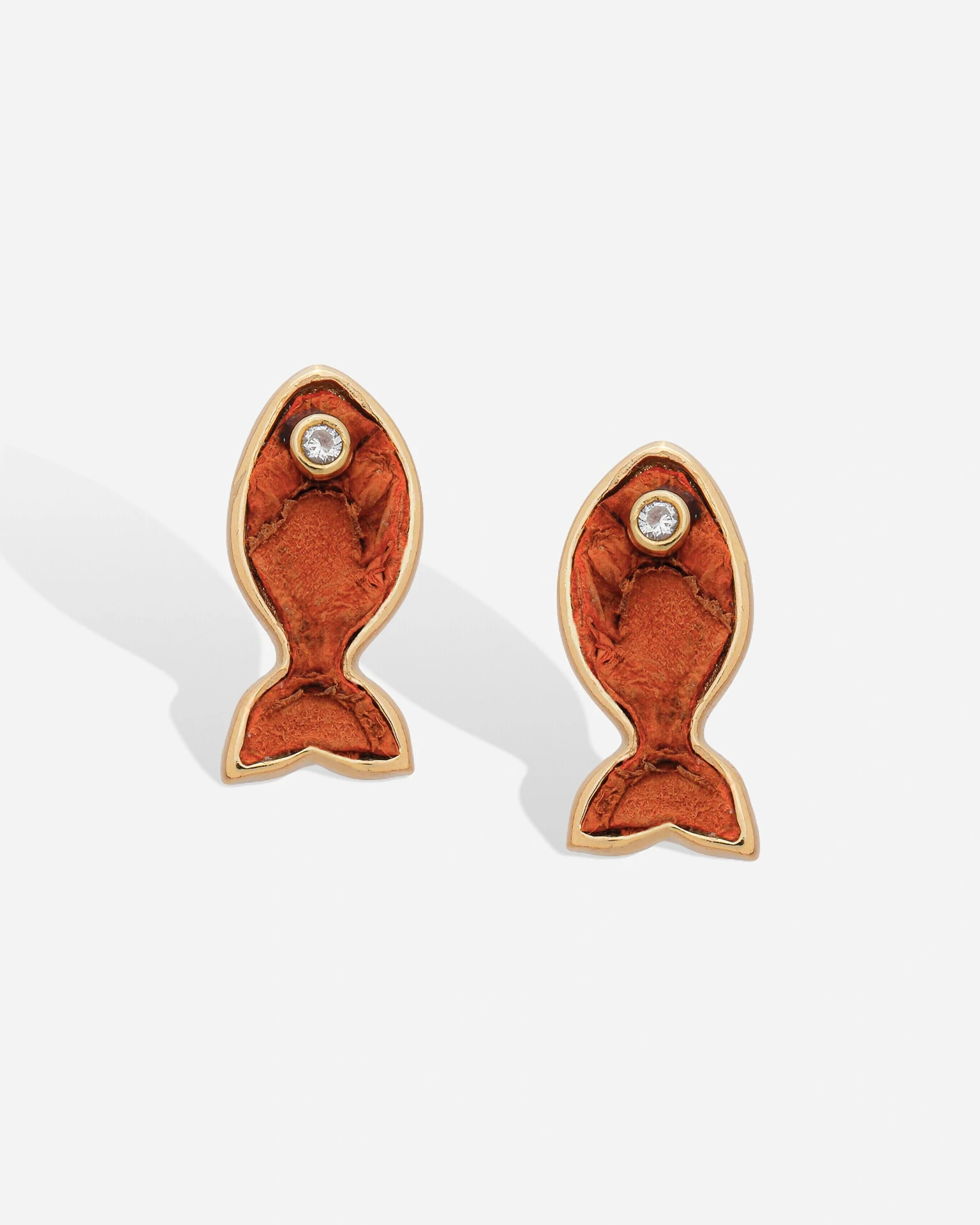 Brinco Peixe Tuna, confeccionado com couro desidratado e diferentes colorações, em seu olho sendo uma zircônia cristal. A moldura em sua volta sendo em banho de ouro 18k.