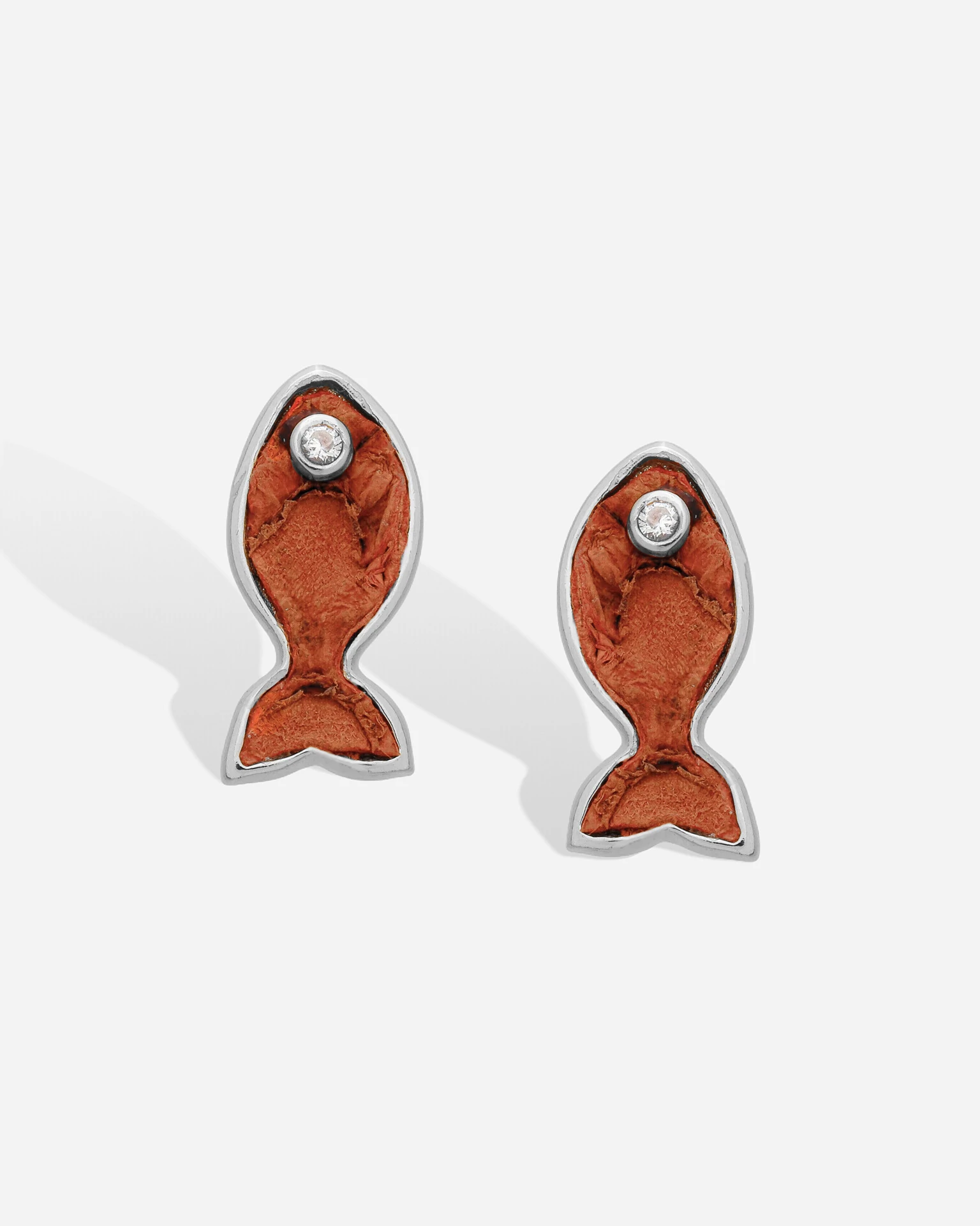 Brinco Peixe Tuna, confeccionado com couro desidratado e diferentes colorações, em seu olho sendo uma zircônia cristal. A moldura em sua volta sendo em banho de Ródio