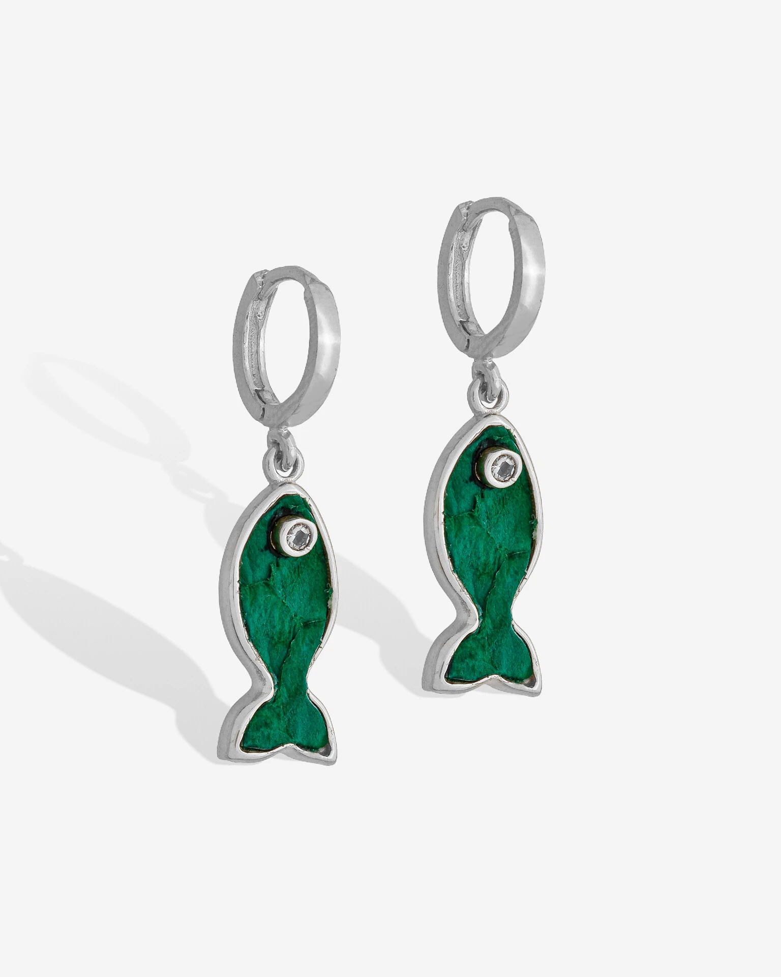 Brinco Peixe Tuna, confeccionado com couro desidratado e diferentes colorações, em seu olho sendo uma zircônia cristal. A moldura em sua volta sendo em banho de ouro 18k.