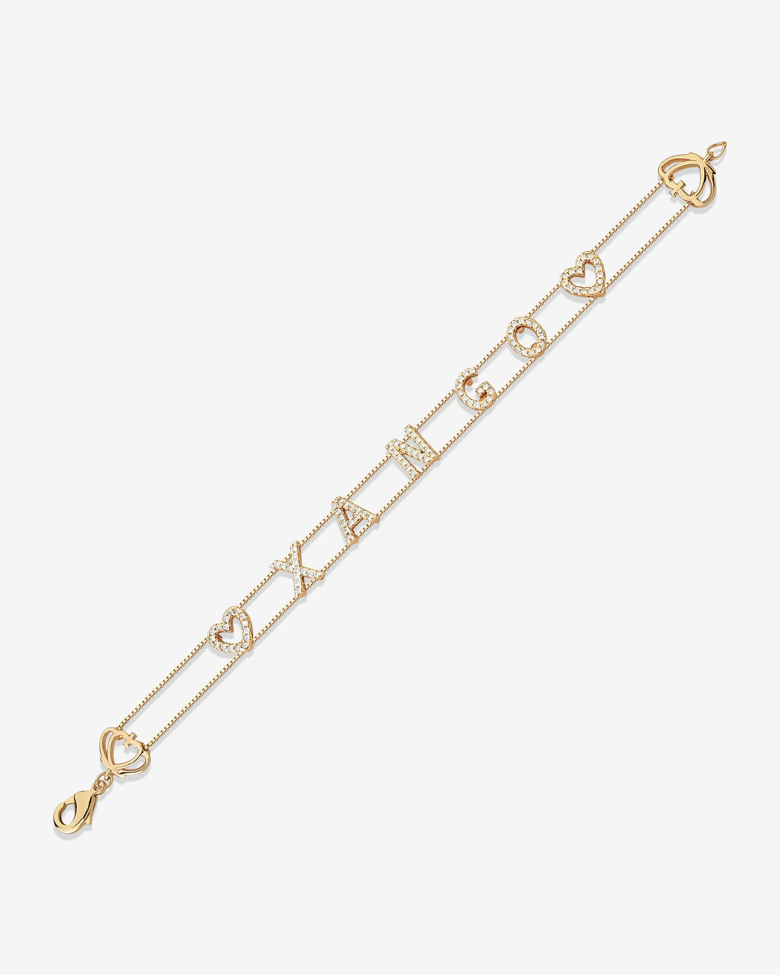 Pulseira delicada e cheia de significado, composta por duas correntes finas que sustentam a palavra “XANGÔ”, formada por letras cravejadas com microzircônias. O design é complementado por corações vazados, trazendo um toque de afeto e simbologia à peça.
