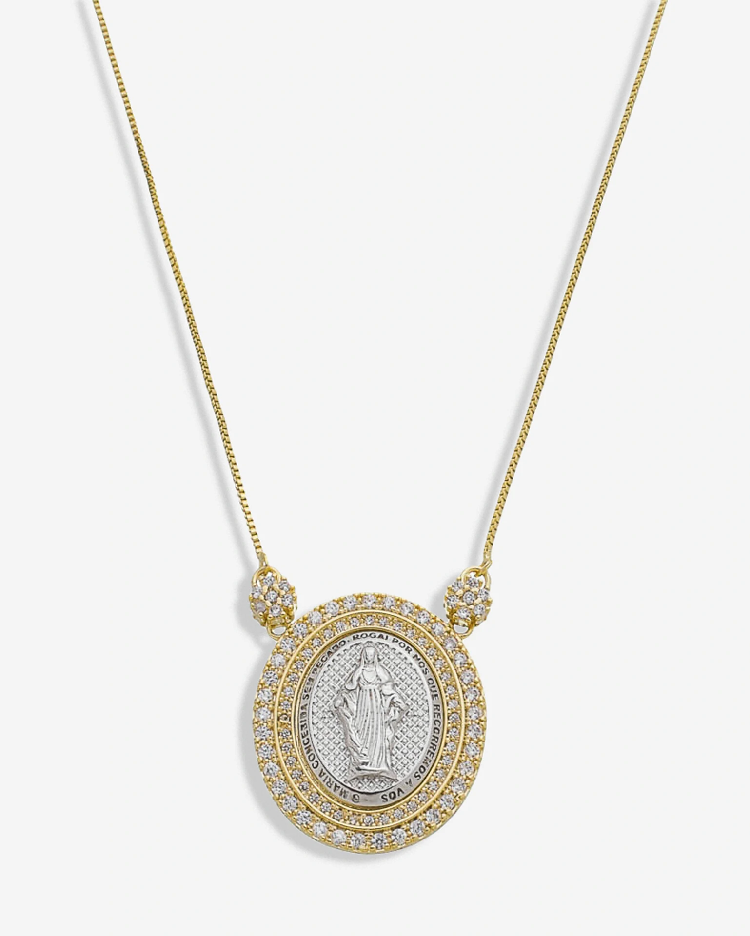 O clássico religioso reinventado. Com corrente veneziana delicada, esta medalha oval se destaca pelo contraste elegante entre o banho em Ouro18k e o centro em banho de ródio. O acabamento cravejado em Zirconias ao redor da moldura e nos conectores adiciona um brilho precioso, tornando esta peça ideal tanto para o dia a dia quanto para ocasiões especiais